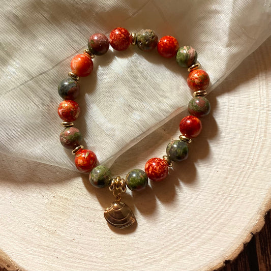 B24-F20 - Stretch Orange and Gold Bracelet w/ Shell Charm