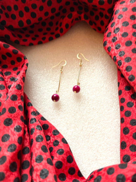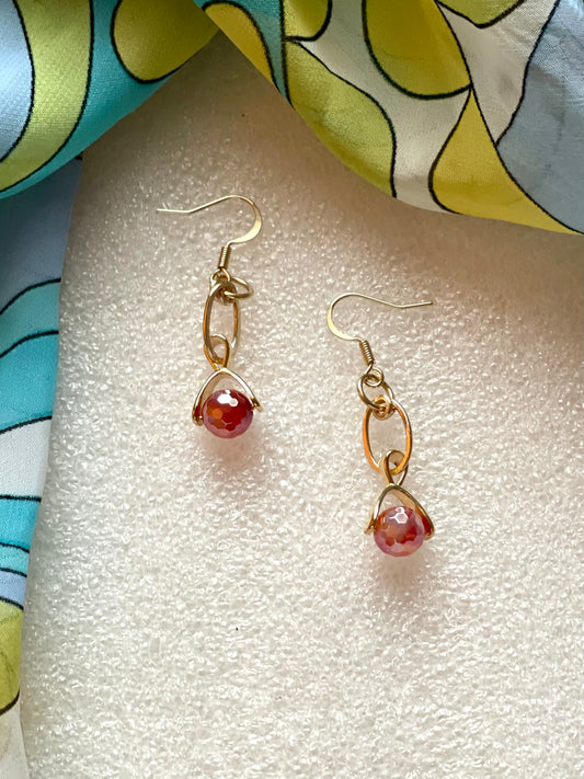 25 E24 Red-orange faceted dangle on gold earring