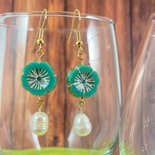 VE24-23 - Teardrop Green & Pearl Dangle Earrings