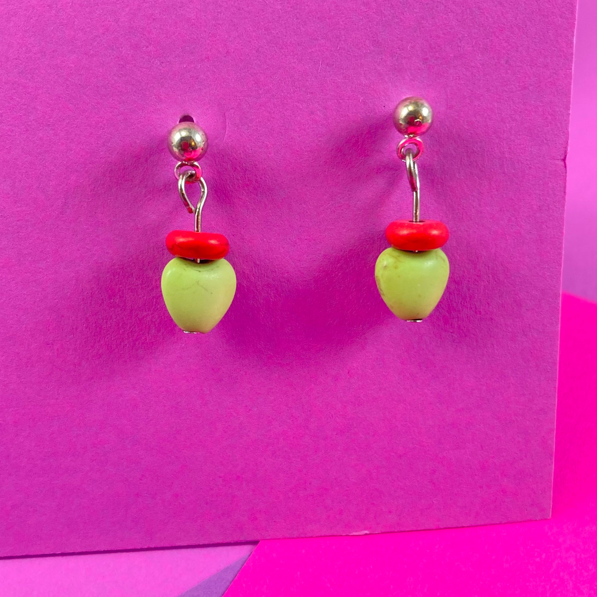 Earrings: Girl's green howlite heart stone earring with red-orange abacus stone accent on silver ball post.