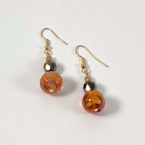 Necklace and earring set: Amber glass lampwork beads (metallic gold/topaz color) with Czech fire polished glass beads, bronze colored spacers. Necklace - 17 inches, gold toggle clasp. Earrings with gold fish hooks.