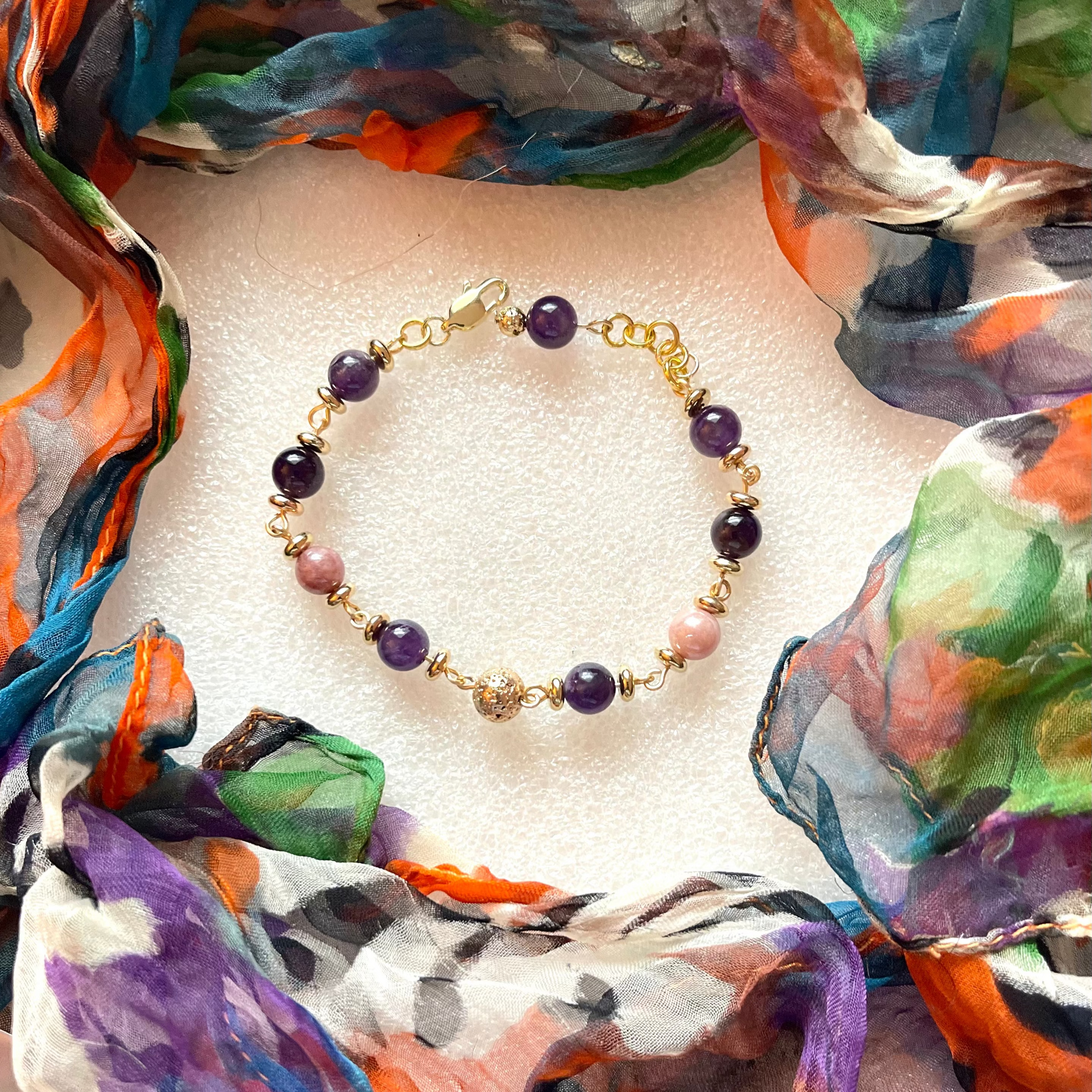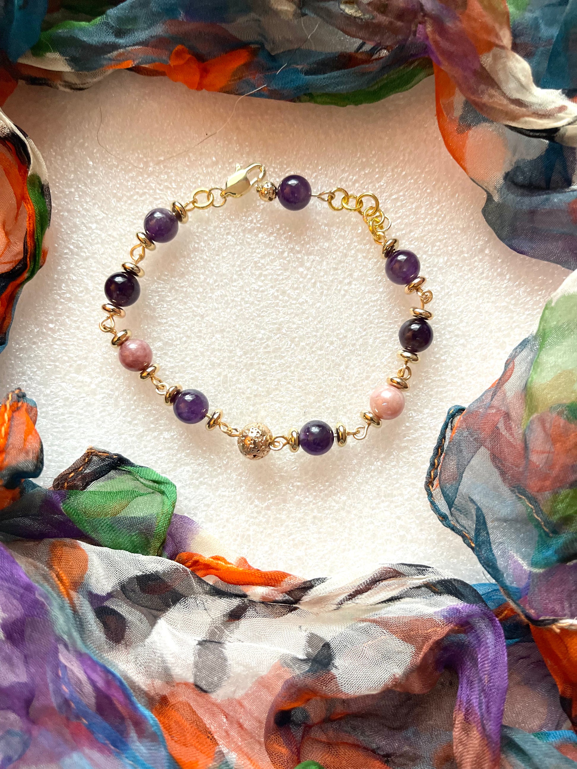 7.5" (including clasp) Gold linked bracelet with gold lava center surrounded by 8mm amethyst and sunstone beads. Gold lobster claw clasp.