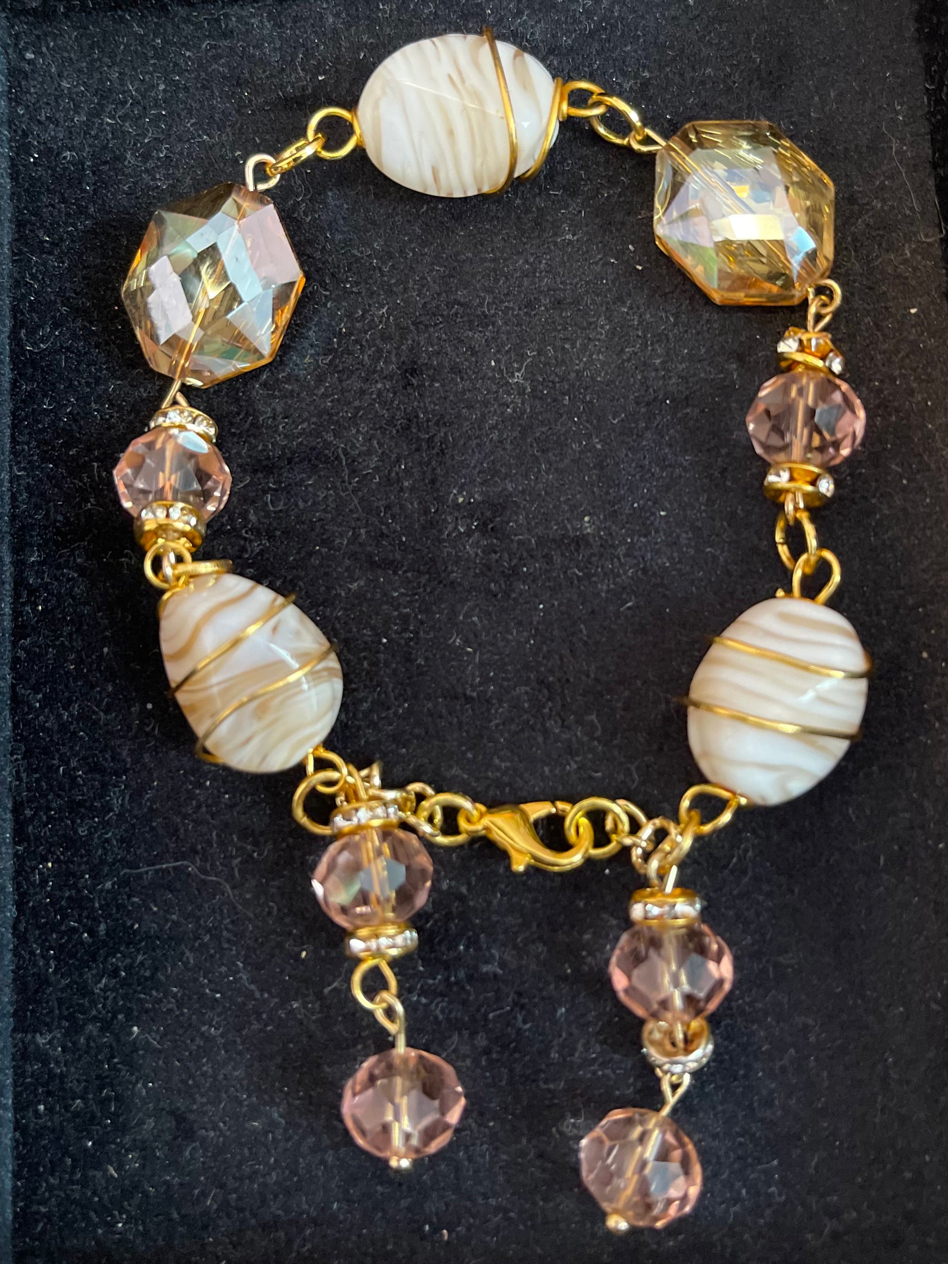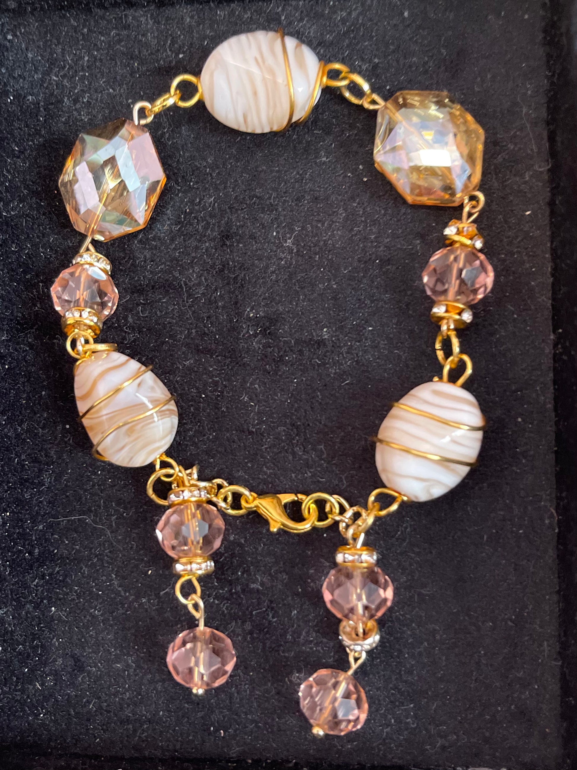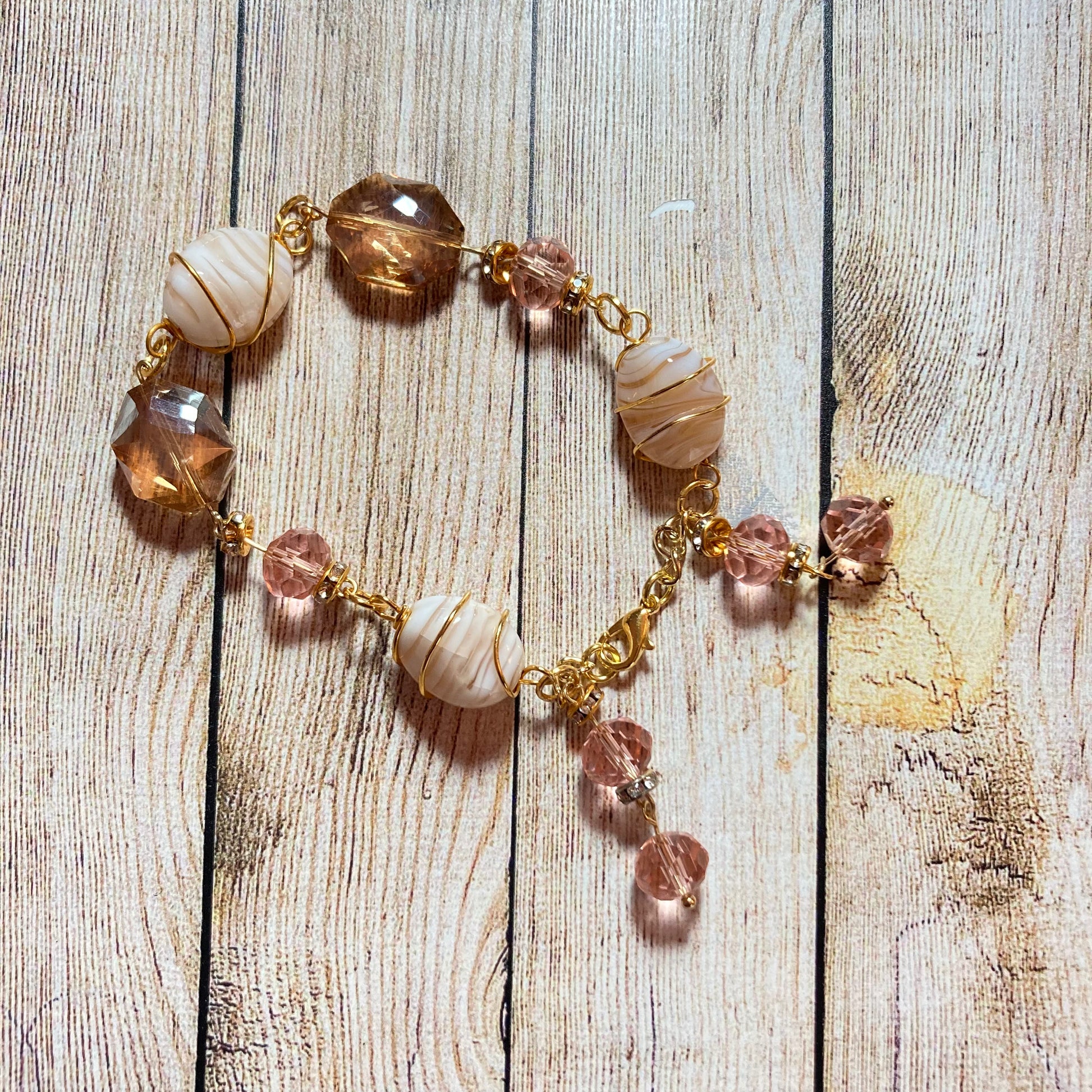 Charming 8" gold linked amber and peach faceted glass with wire-wrapped nuggets, Lobster claw clasp.