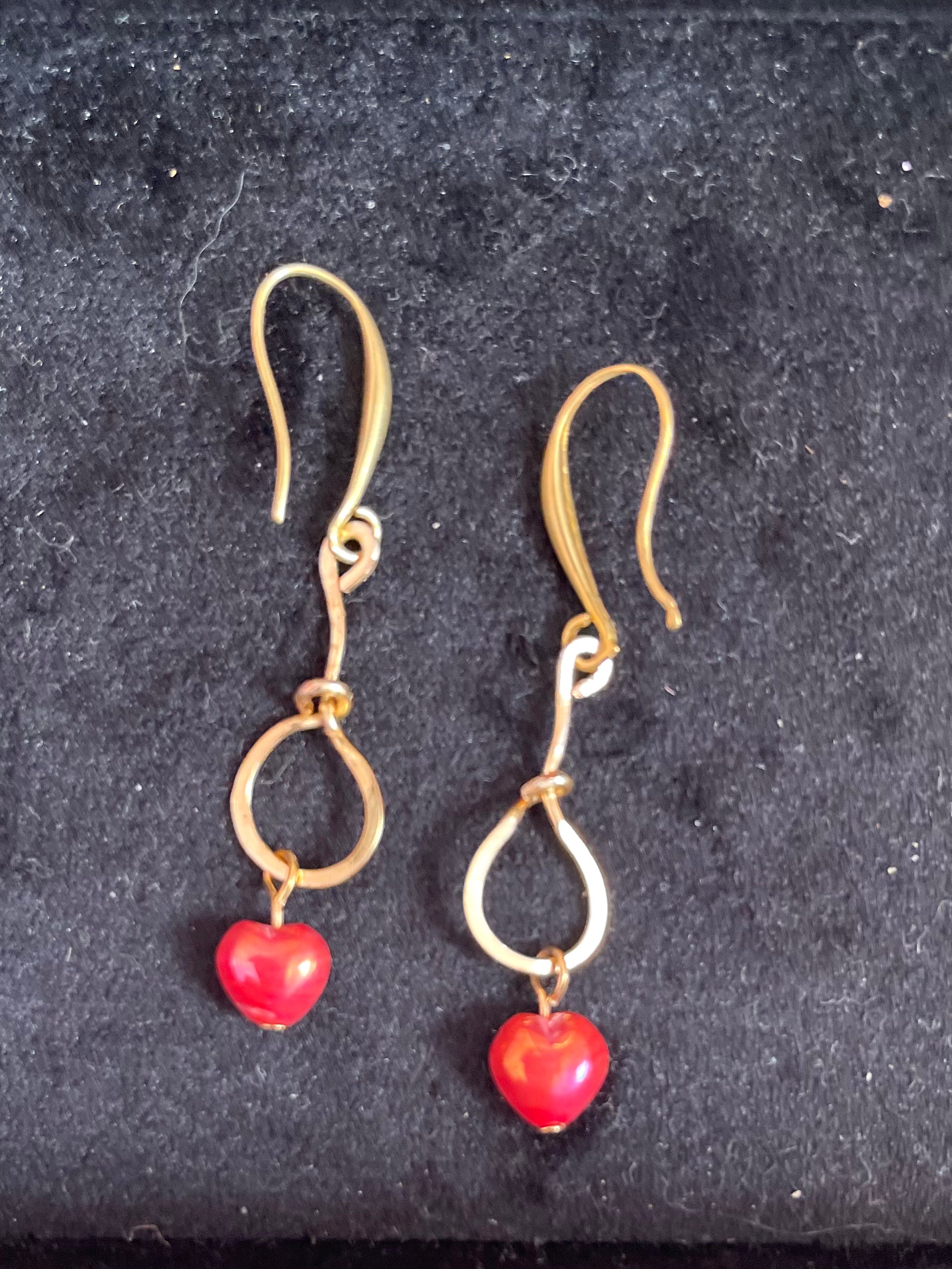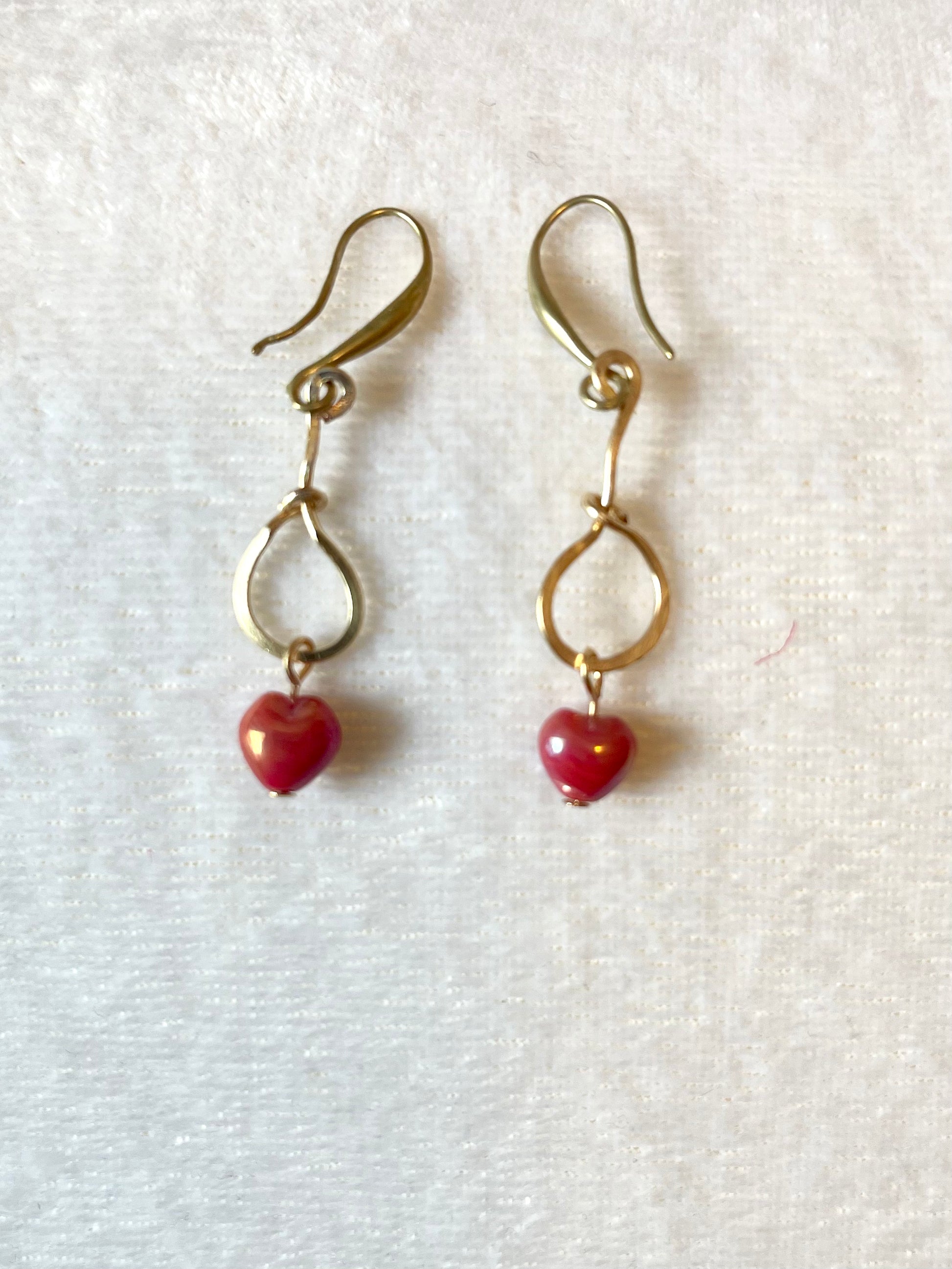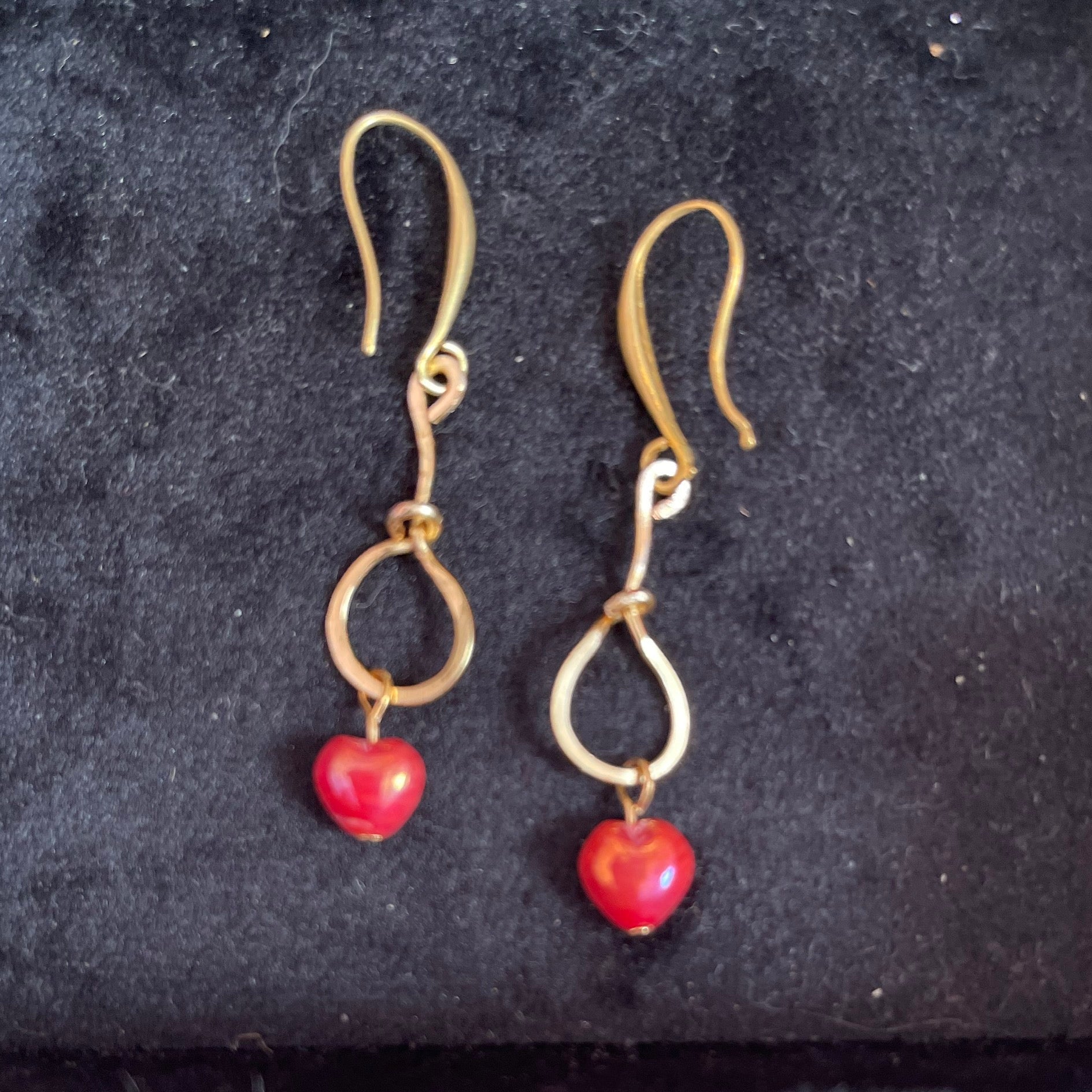 Beautifully designed hammered tarnish resistant gold-copper earrings with reddish orange glass hearts on gold hooks.