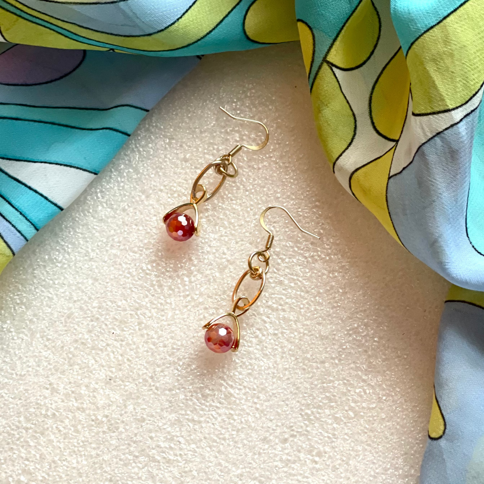Lovely handmade hammered tarnish resistant gold-copper earrings with red-orange faceted glass dangle on gold hooks