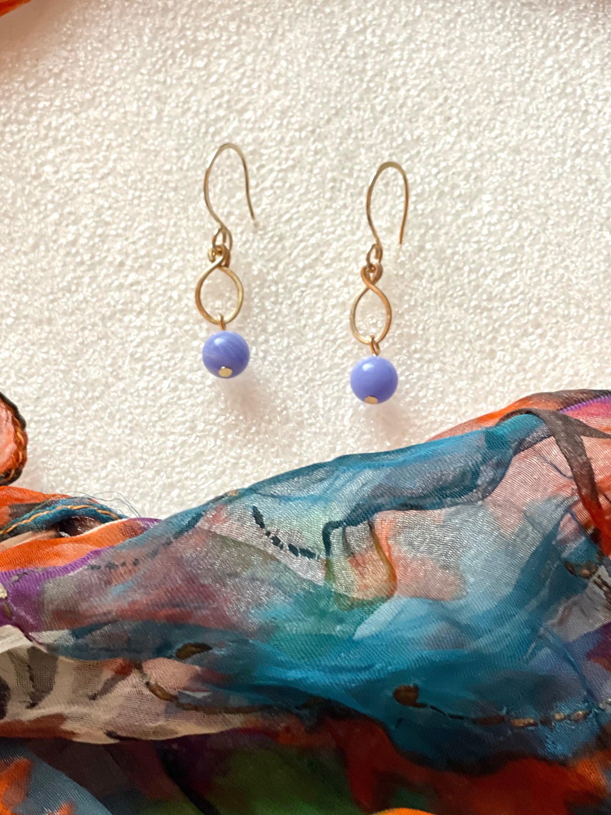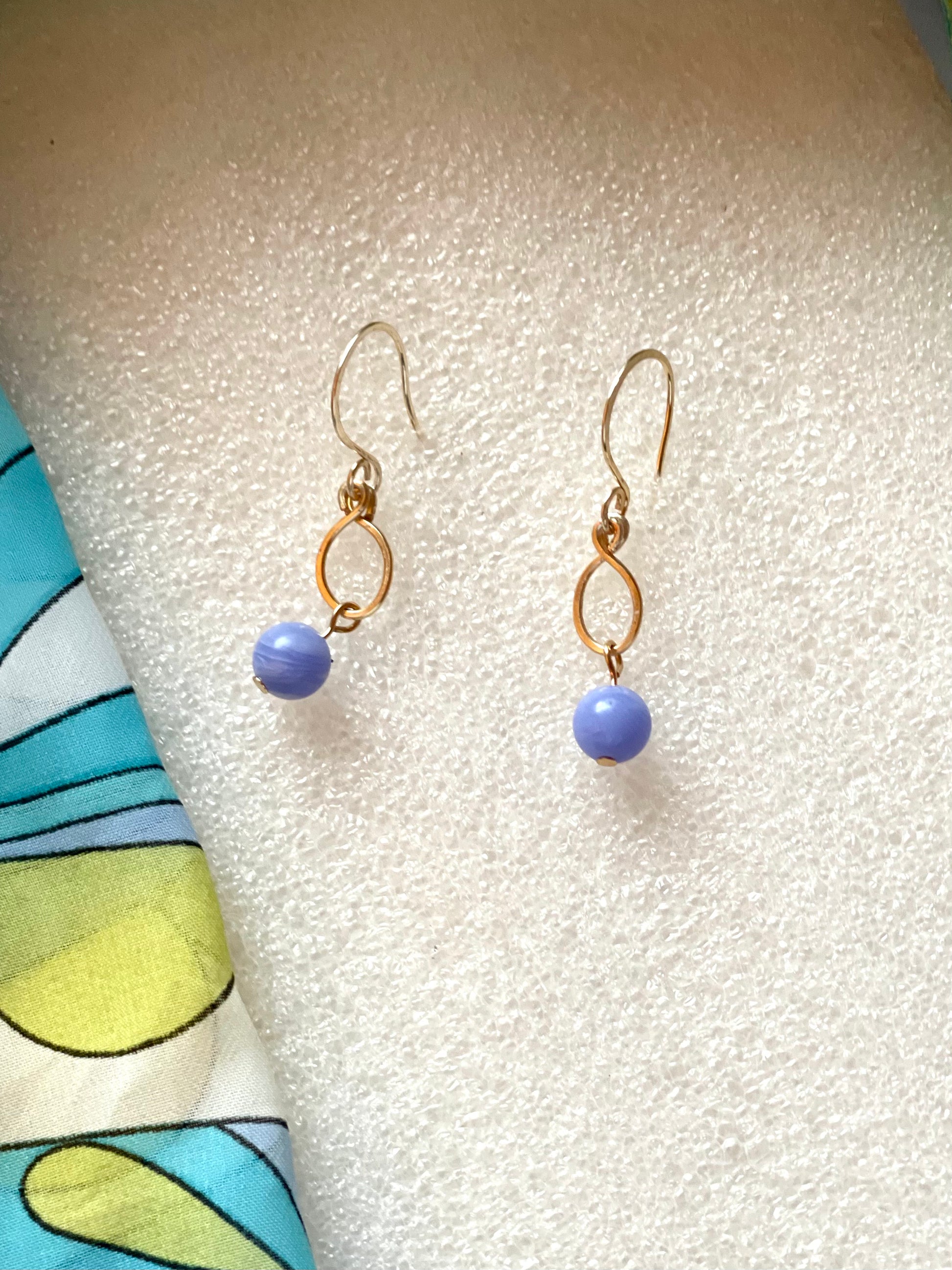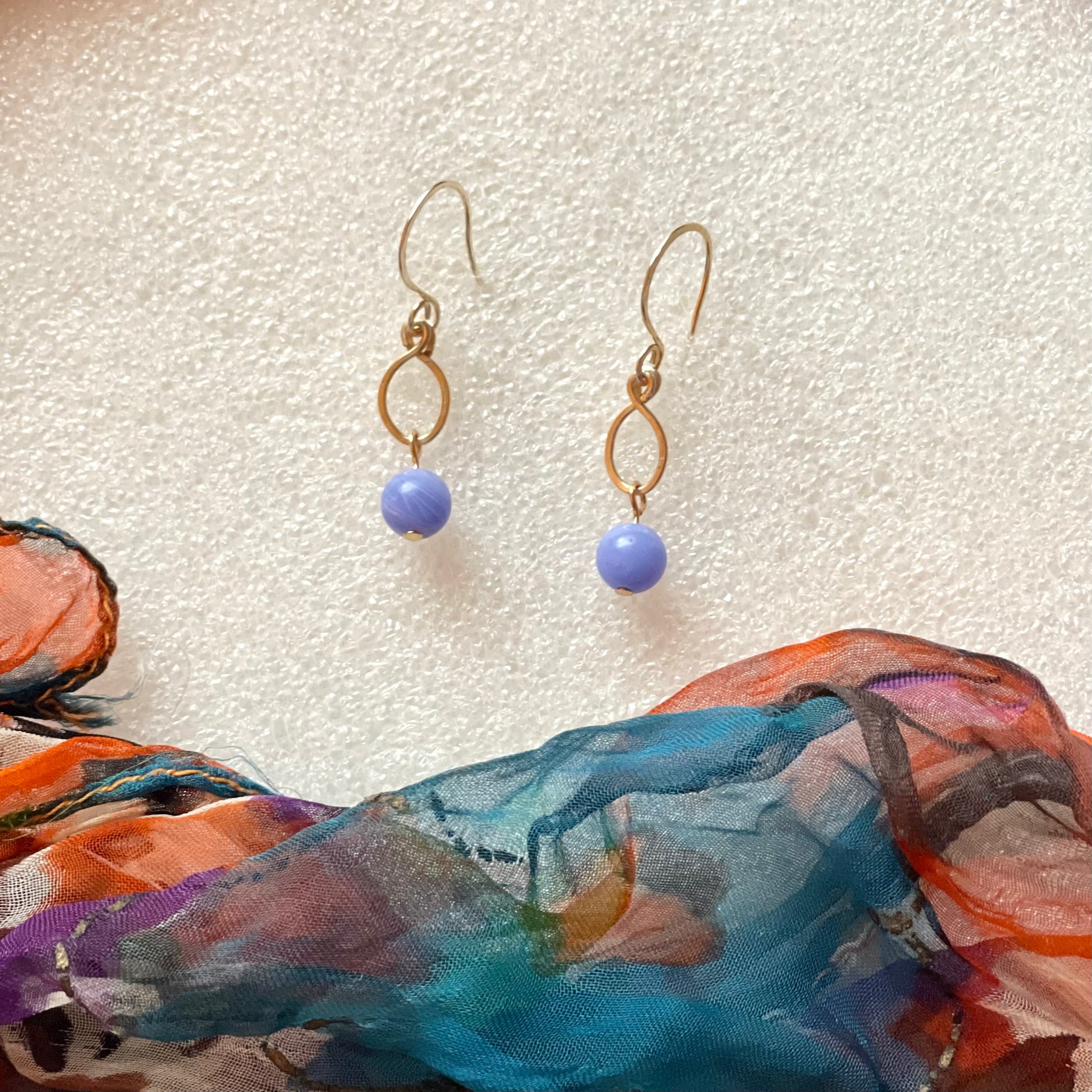Handmade hammered gold-copper earring with 8mm blue lace agate dangle on hooks