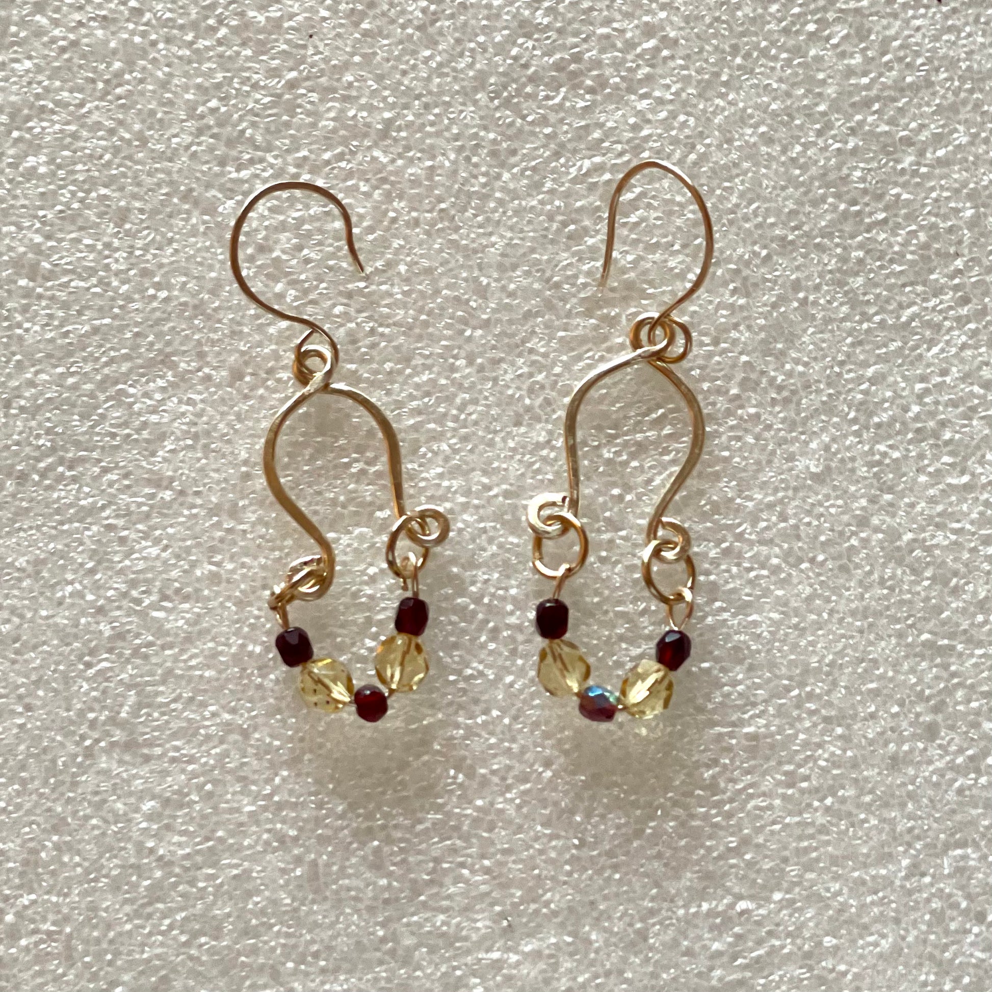 Fashionable hammered horseshoe-shaped tarnish resistant gold-copper earrings with sunlight faceted glass beads with ruby glass accents on hooks.