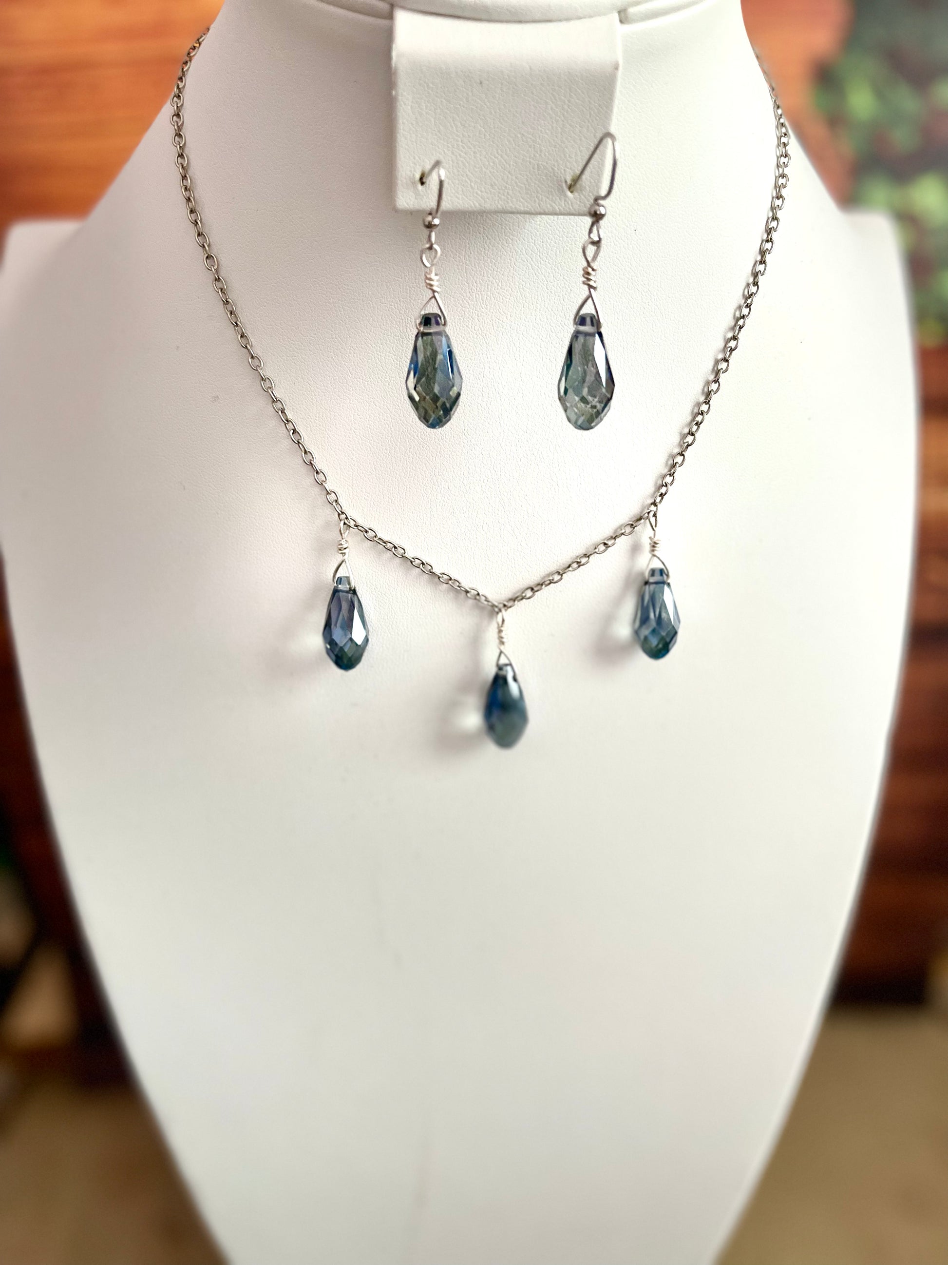 17" Rhodium nickel-free chain necklace with 3 beautiful ice blue faceted glass teardrops, lobster claw clasp. Matching earrings.