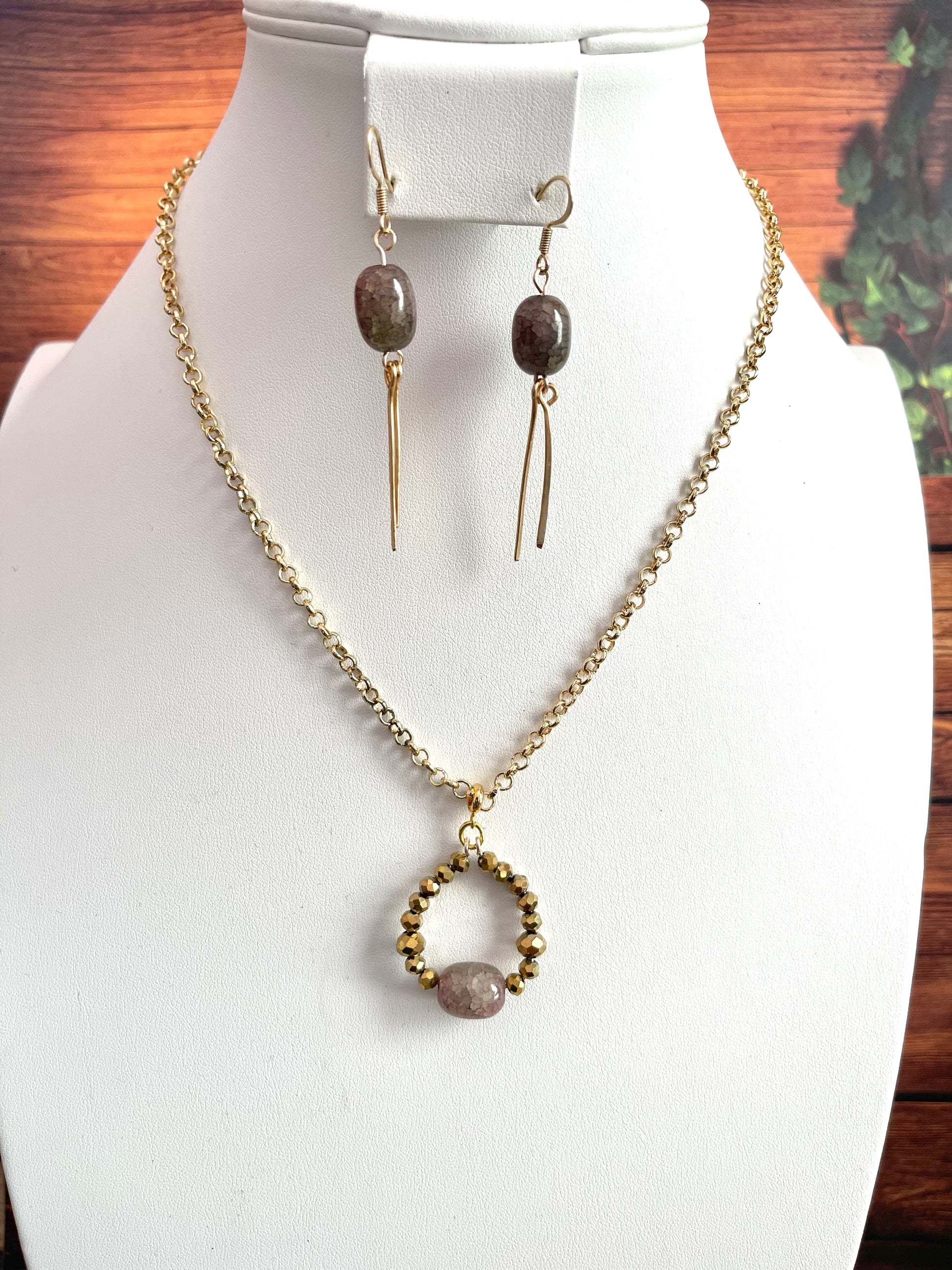 See ProductRadiant 19" necklace. Oval amber dyed fire agate surrounded by gold lava rounds and jasper nuggets on gold chain with lobster clasp.