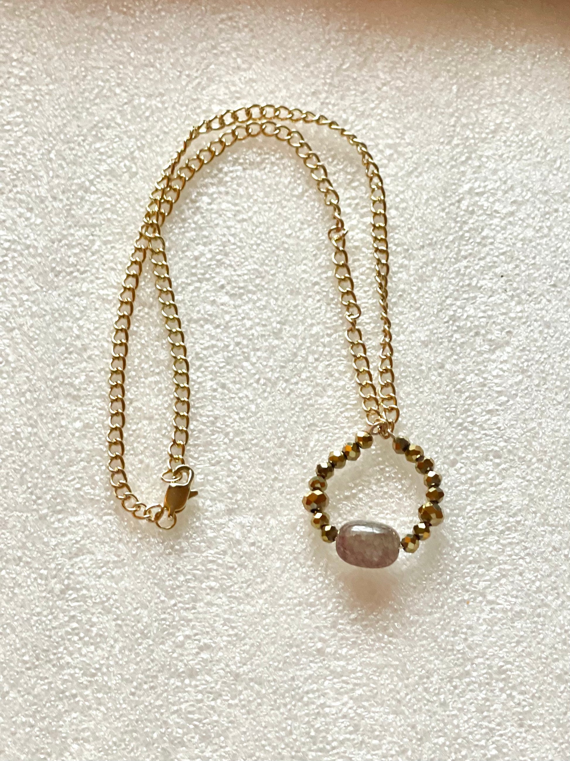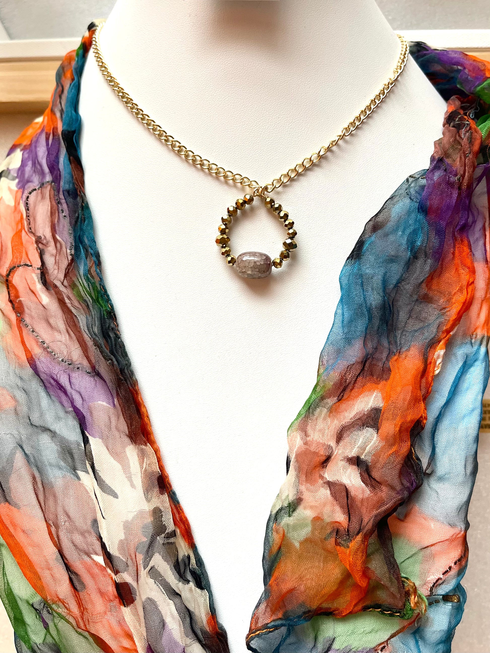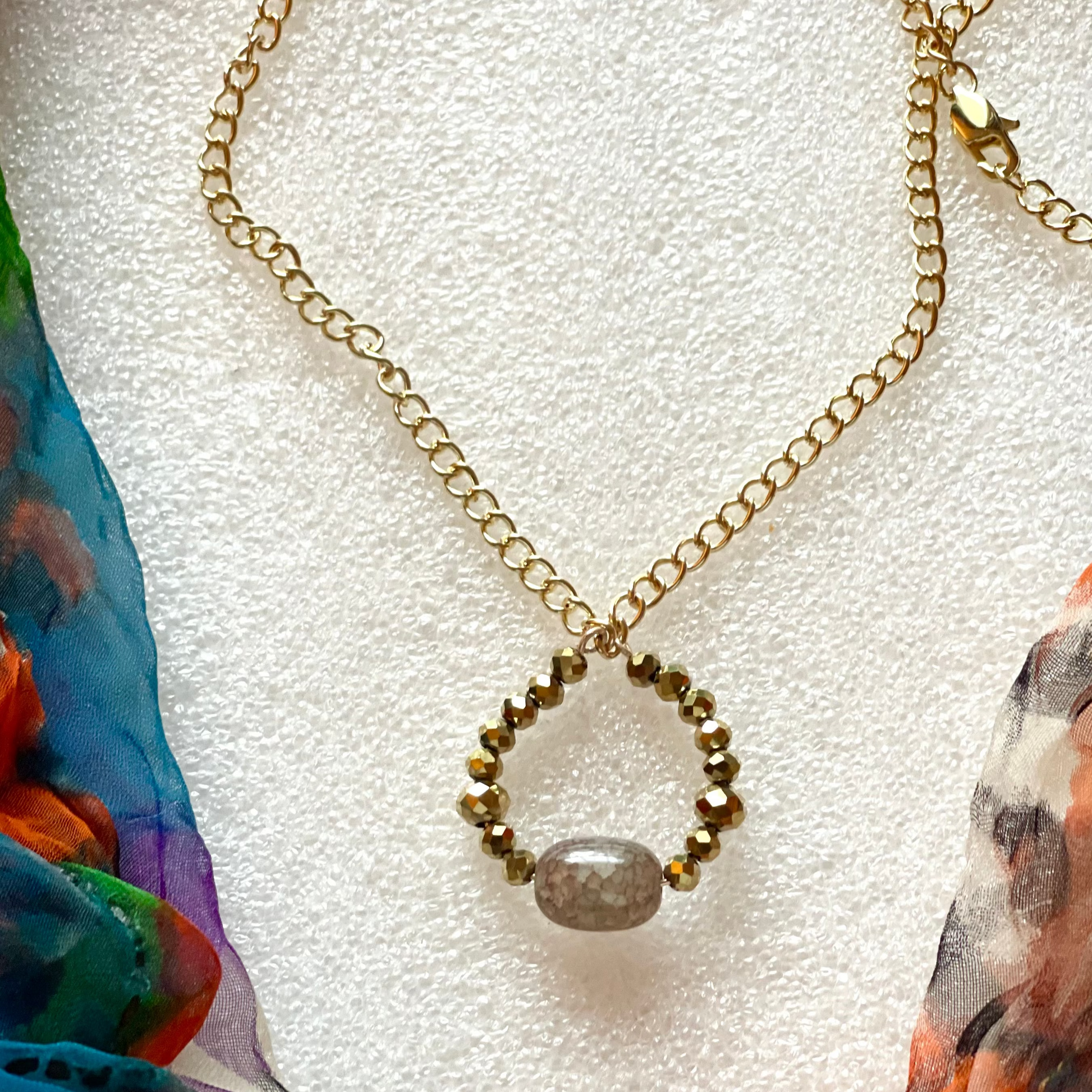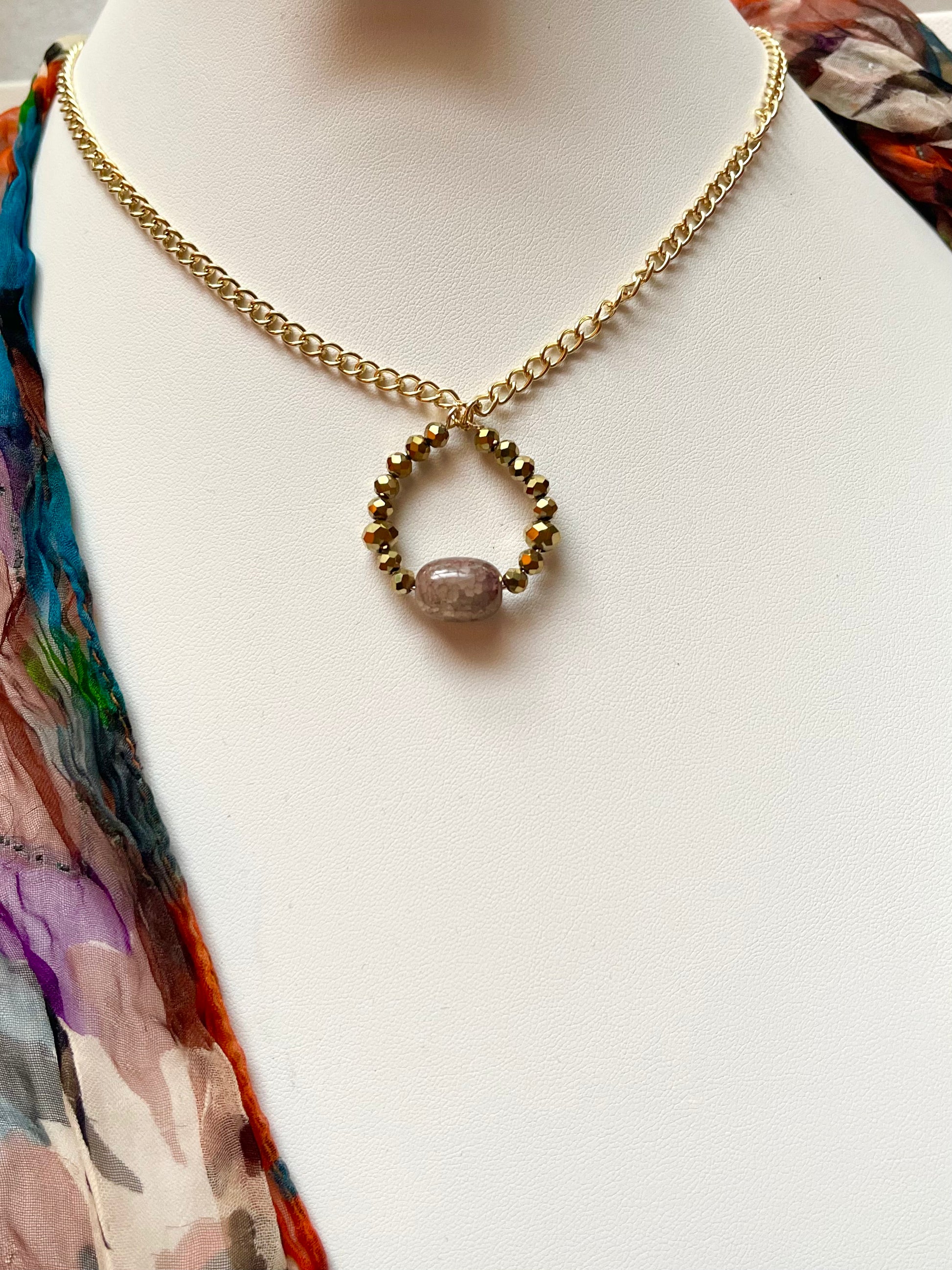 See ProductRadiant 19" necklace. Oval amber dyed fire agate surrounded by gold lava rounds and jasper nuggets on gold chain with lobster clasp.