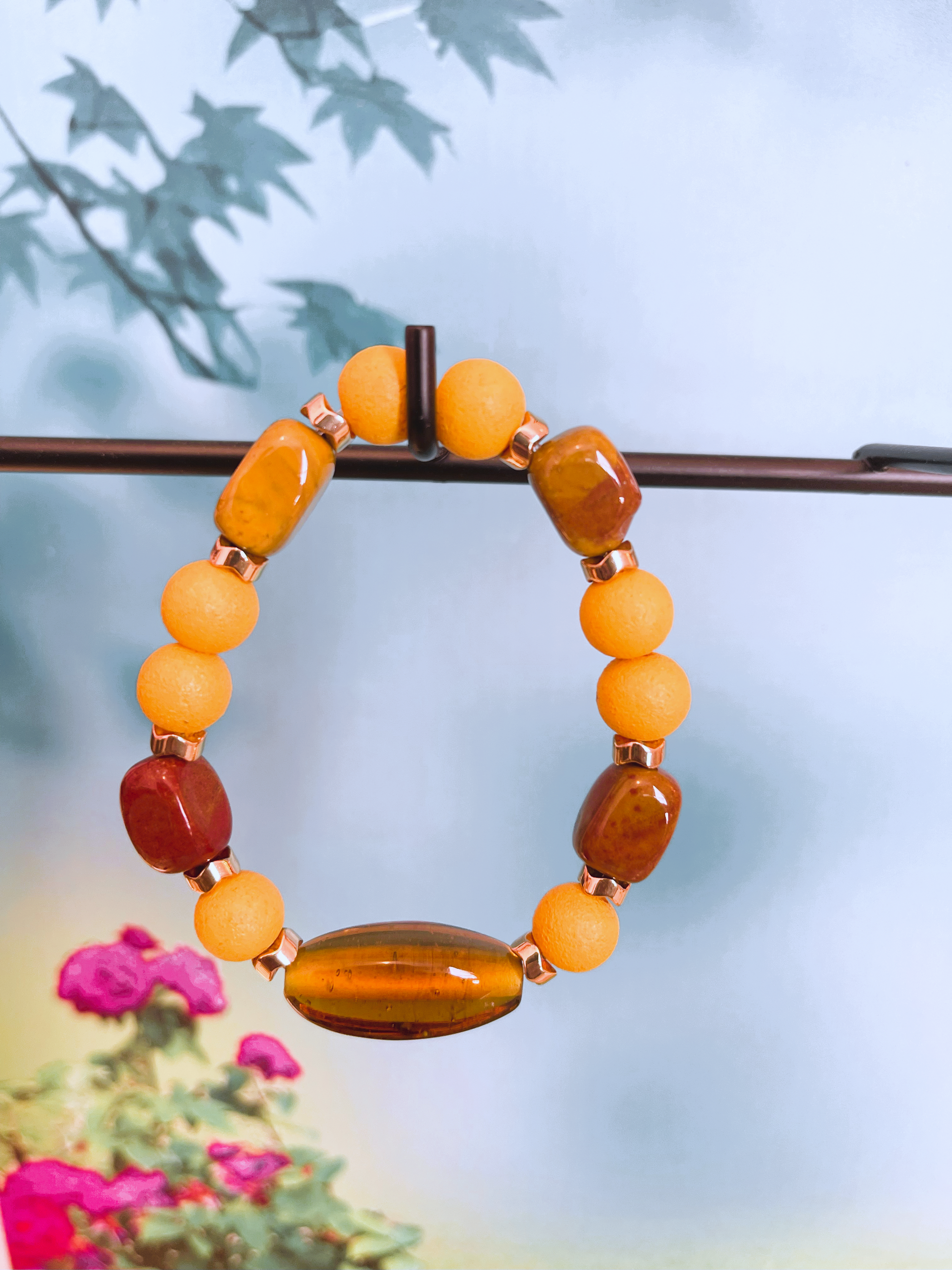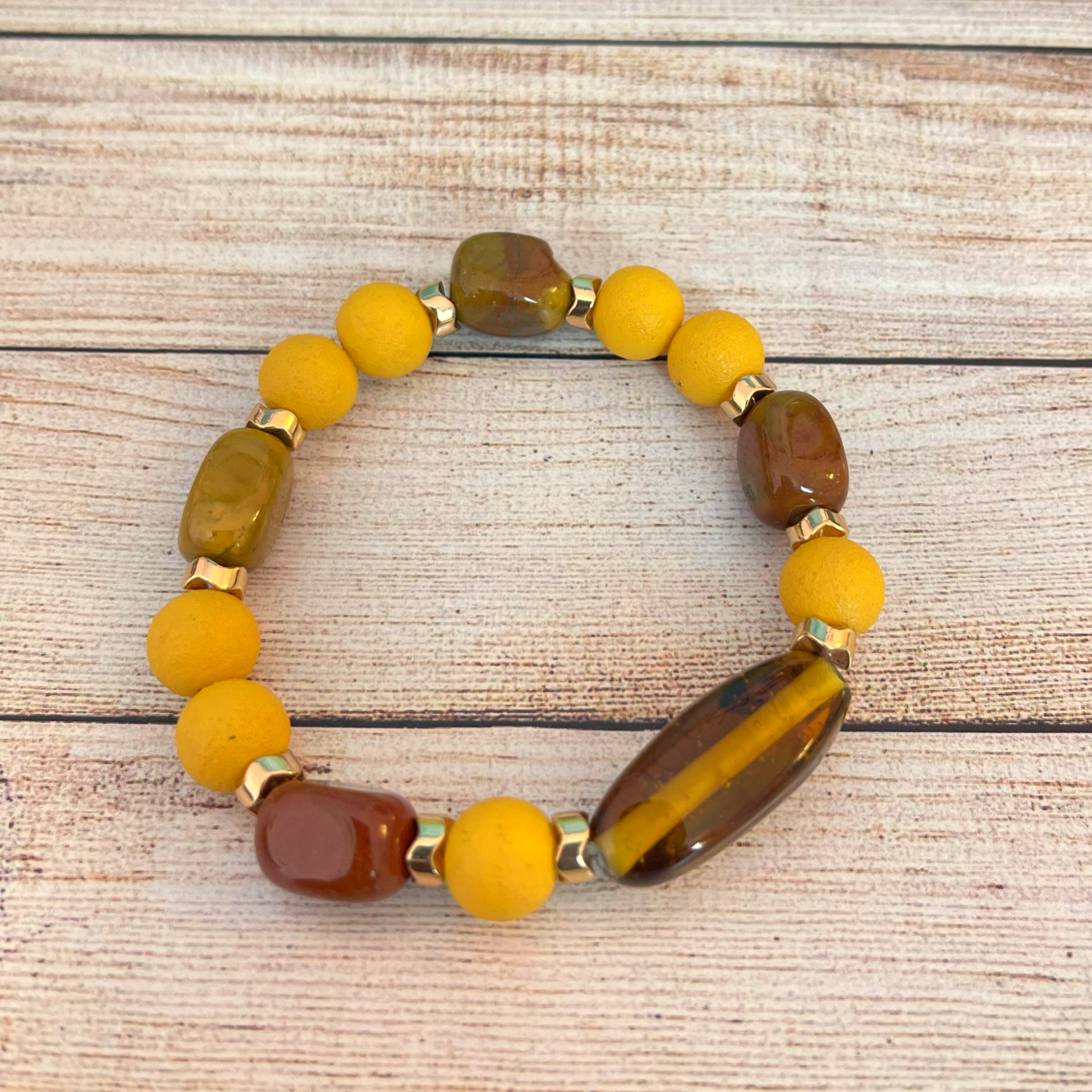 Stretch bracelet highlighting ambler oval focal with frosted yellow glass beads, jasper nuggets and gold rondelles.