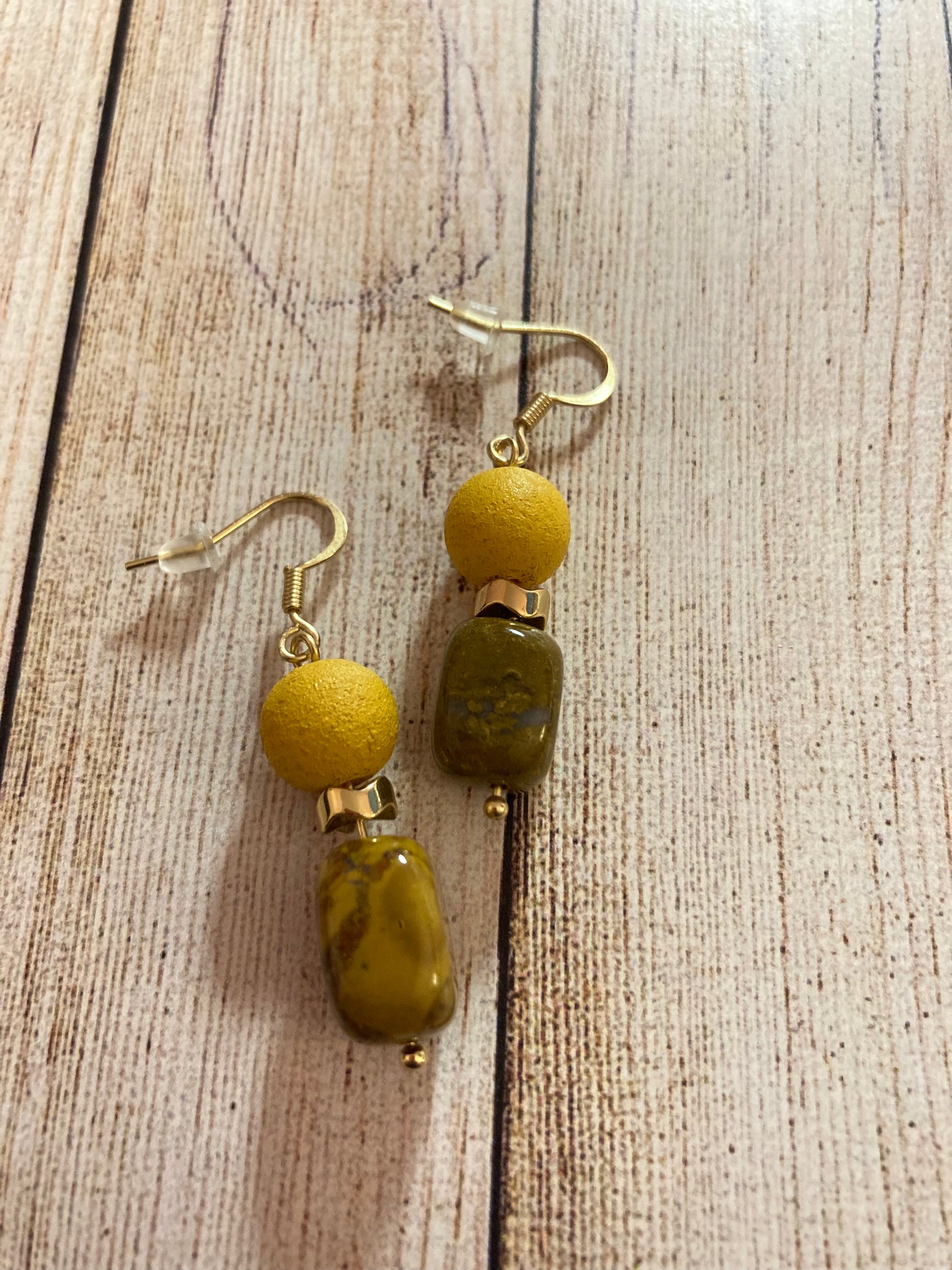 Jasper nugget, yellow frosted glass and rondelle on gold hooks.