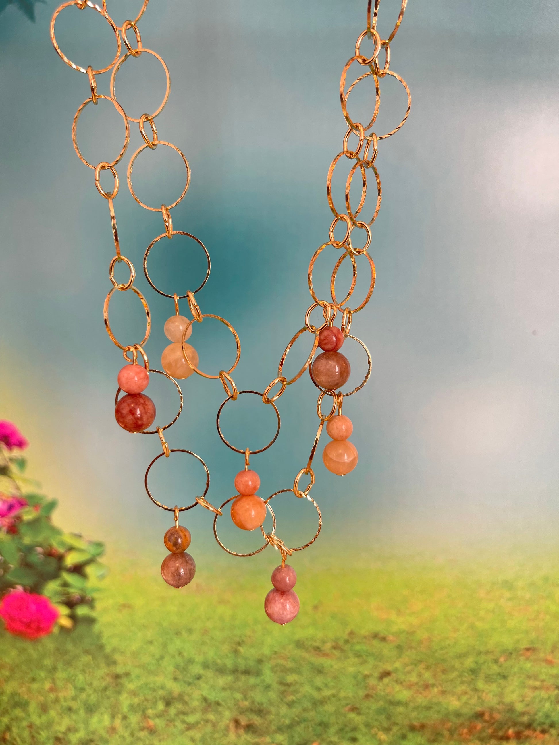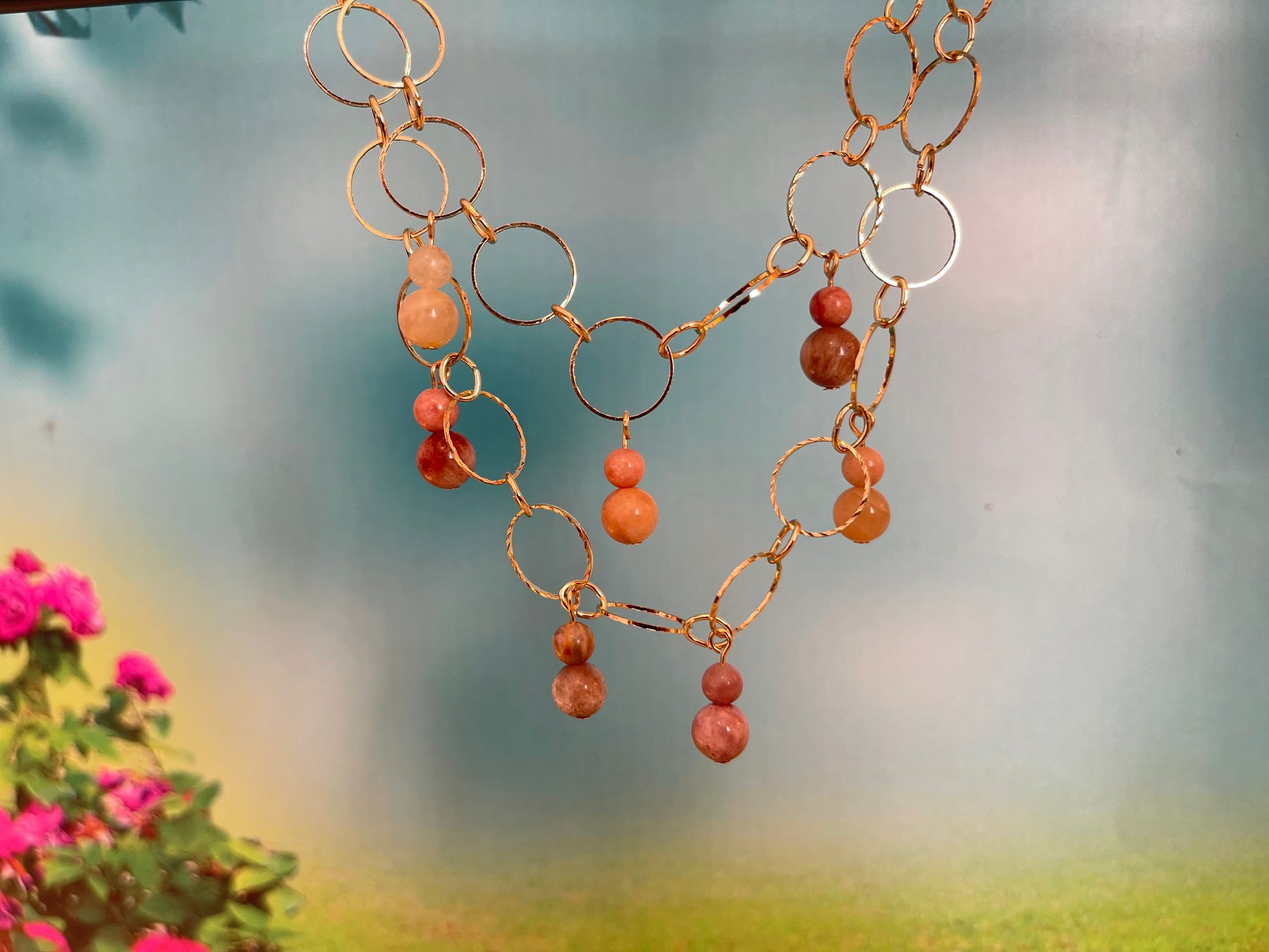See ProductRadiant 19" necklace. Oval amber dyed fire agate surrounded by gold lava rounds and jasper nuggets on gold chain with lobster clasp.