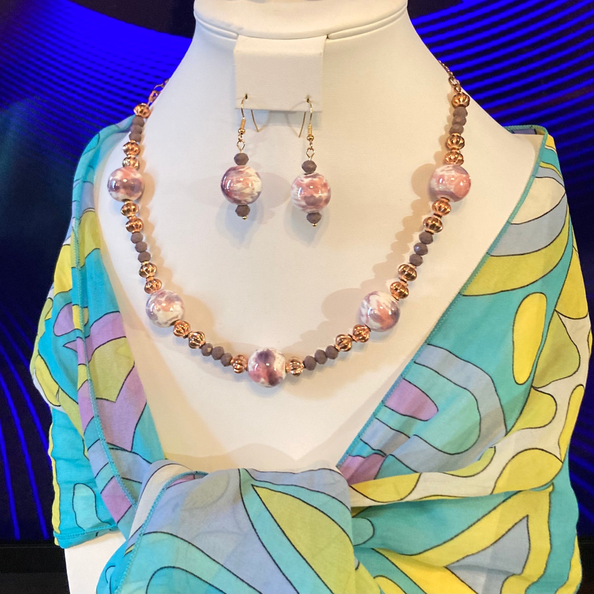 20 inch purplish to pink ceramic beads with rose gold accents and gray-pink glass beads, rose gold chain and lobster clasp.