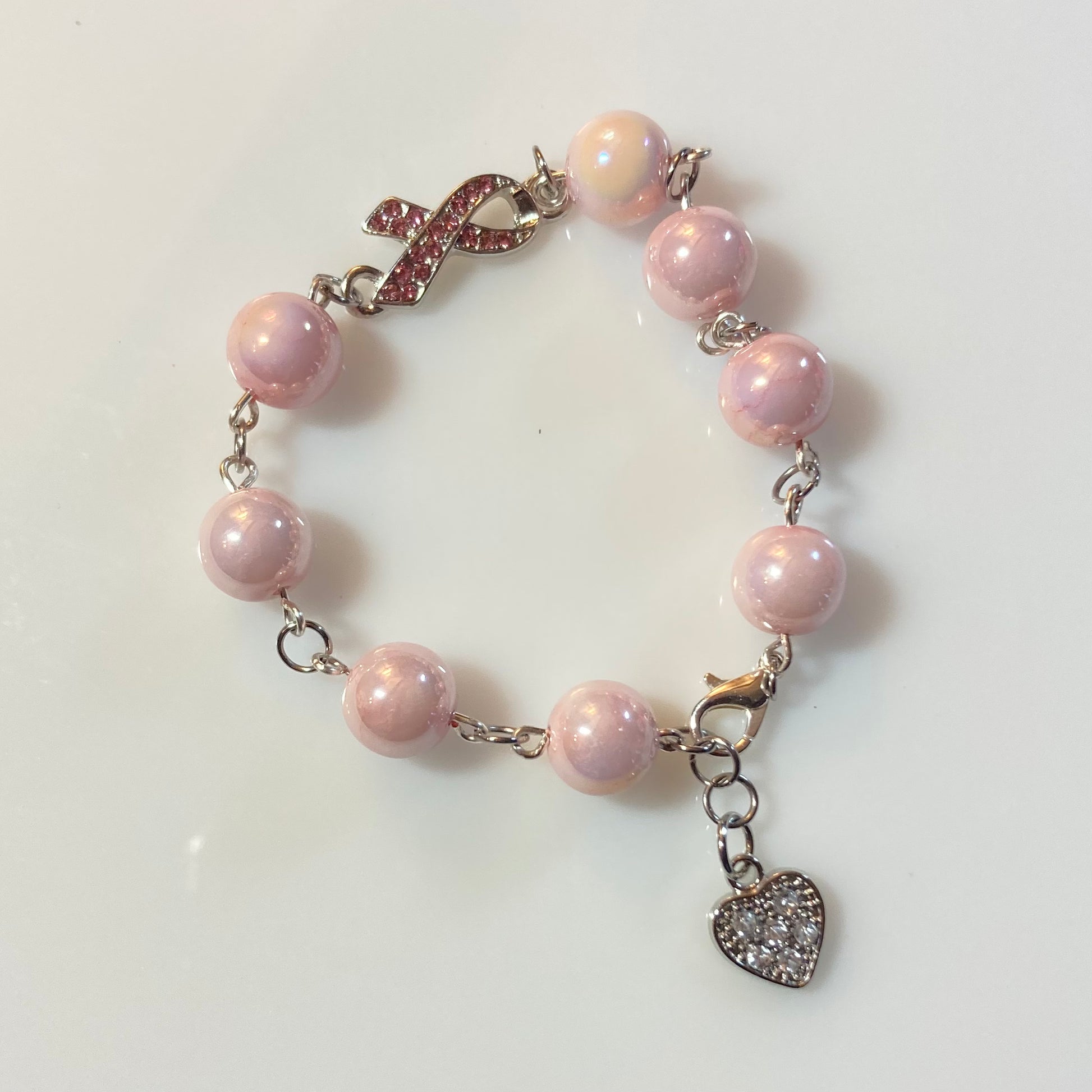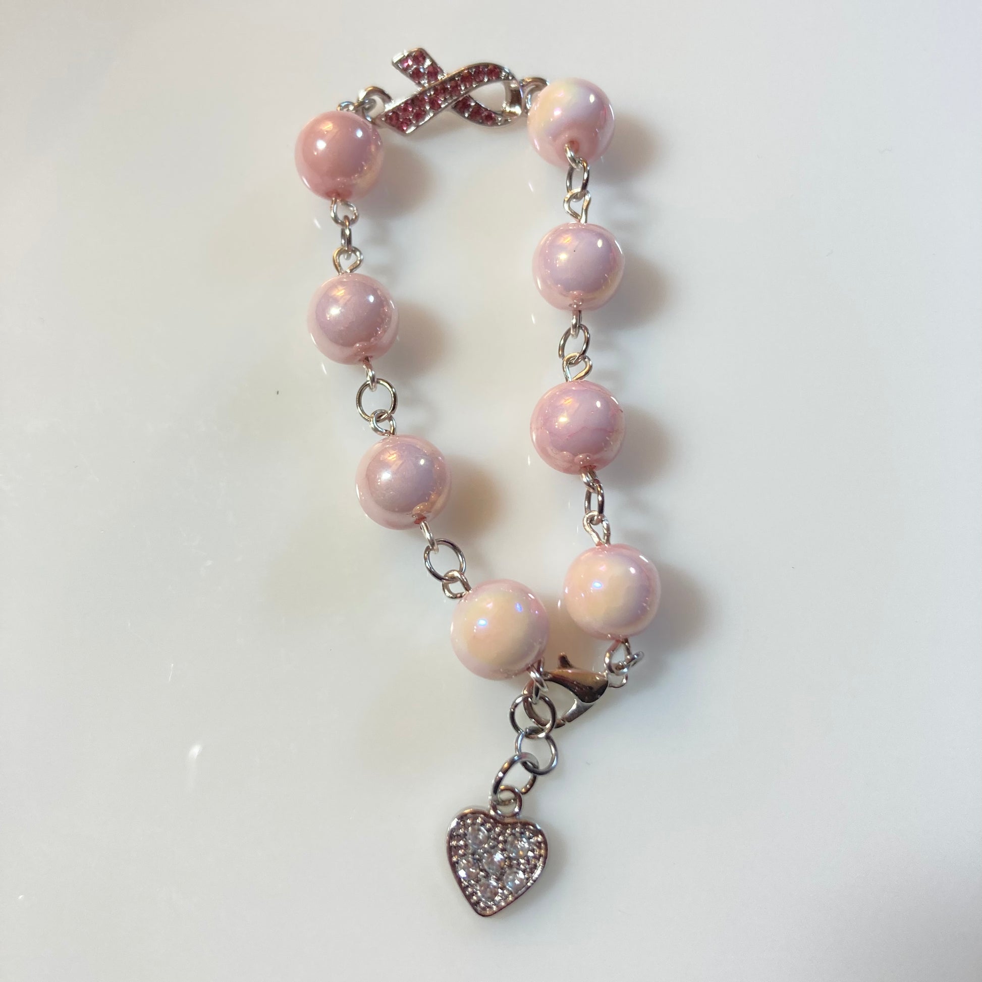 Breast Cancer Survivor round pink glass beads with silver heart charm on silver chain with lobster clasp