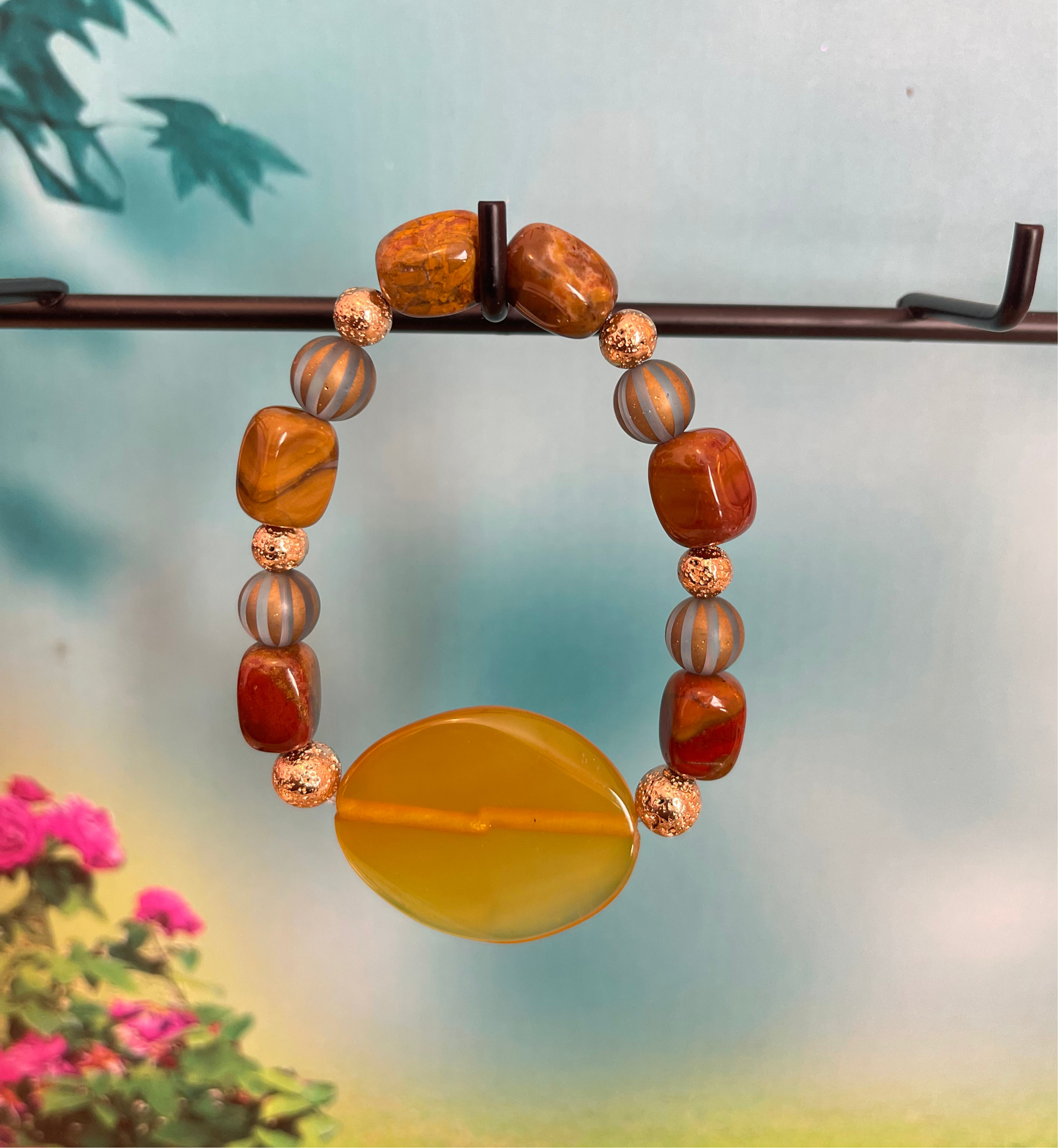 See ProductAmber dyed fire agate focal with jasper ovals, glass and gold lava beads.