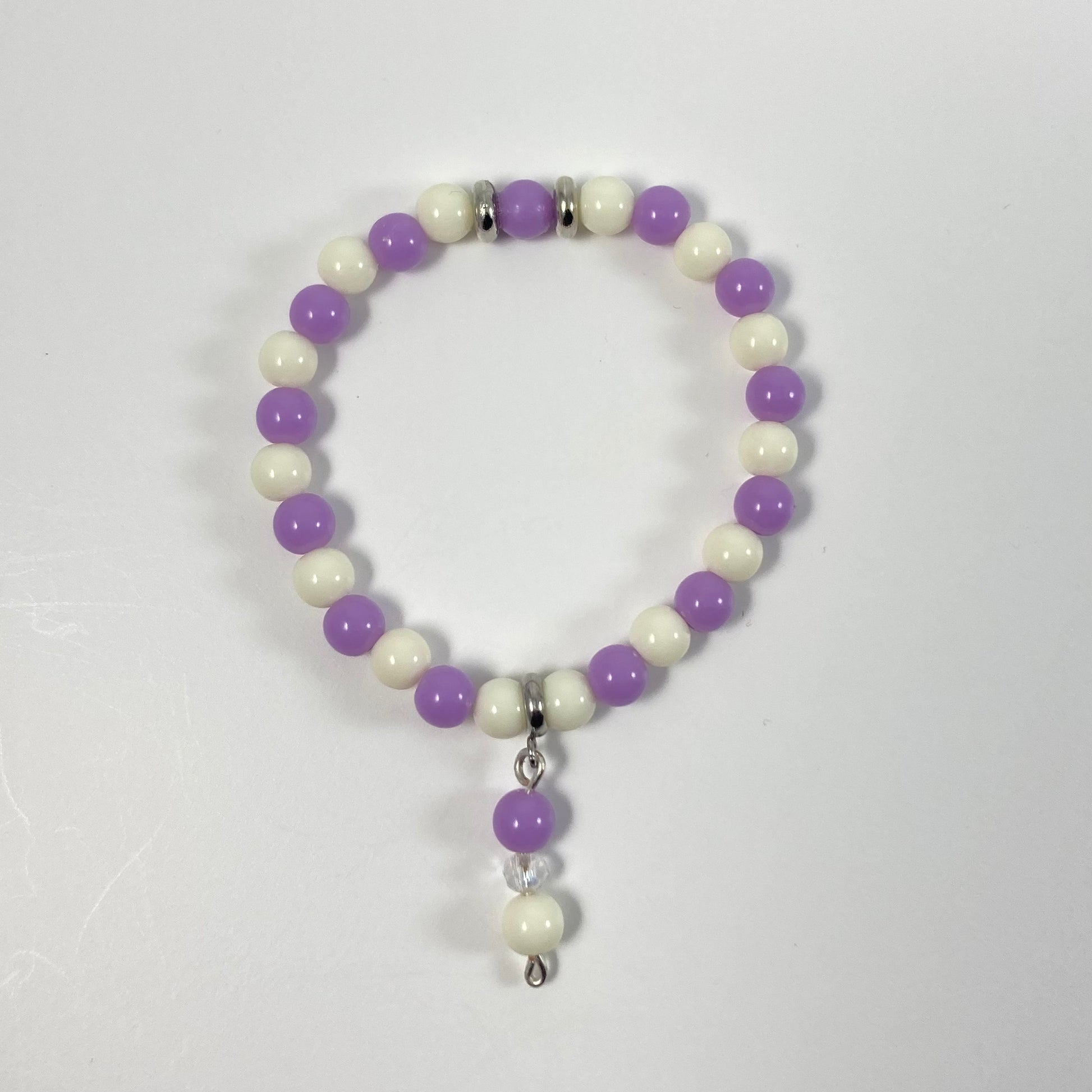 Cute purple and white beaded stretch bracelet with silver rondelle spacers and dangle