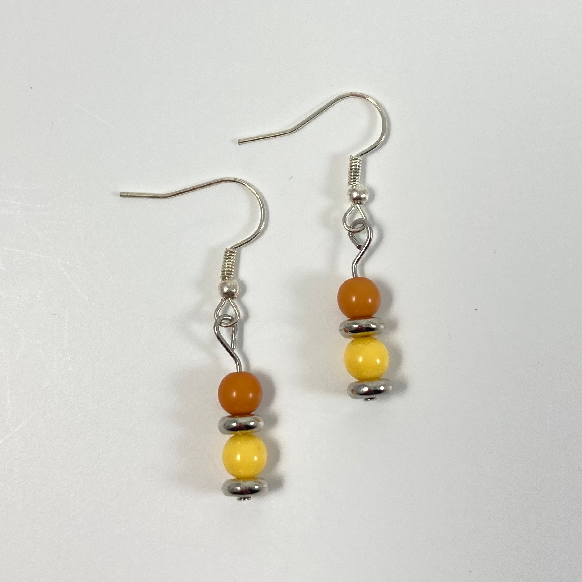 Tan and yellow dainty dangle earrings with silver spacers and hooks