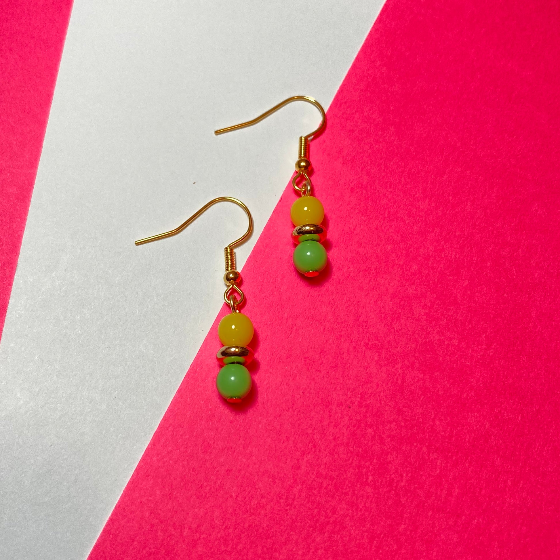 Green and yellow dainty dangle earrings with gold spacers and hooks