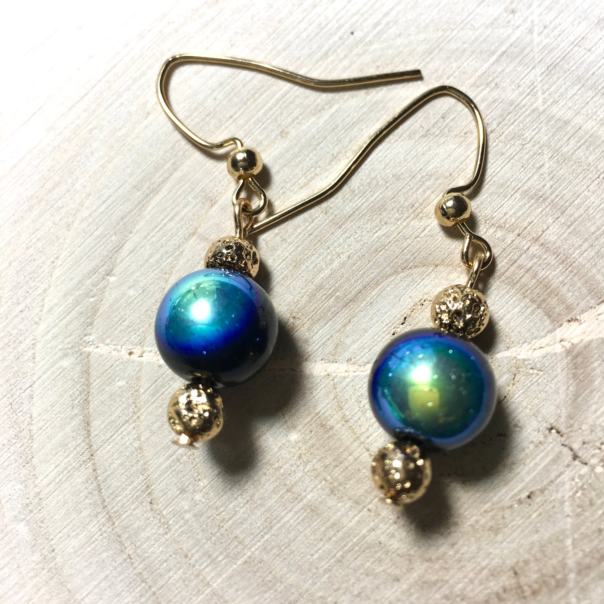 Earrings. 10 mm Glass black aurora borealis with gold lava accents, gold hooks.