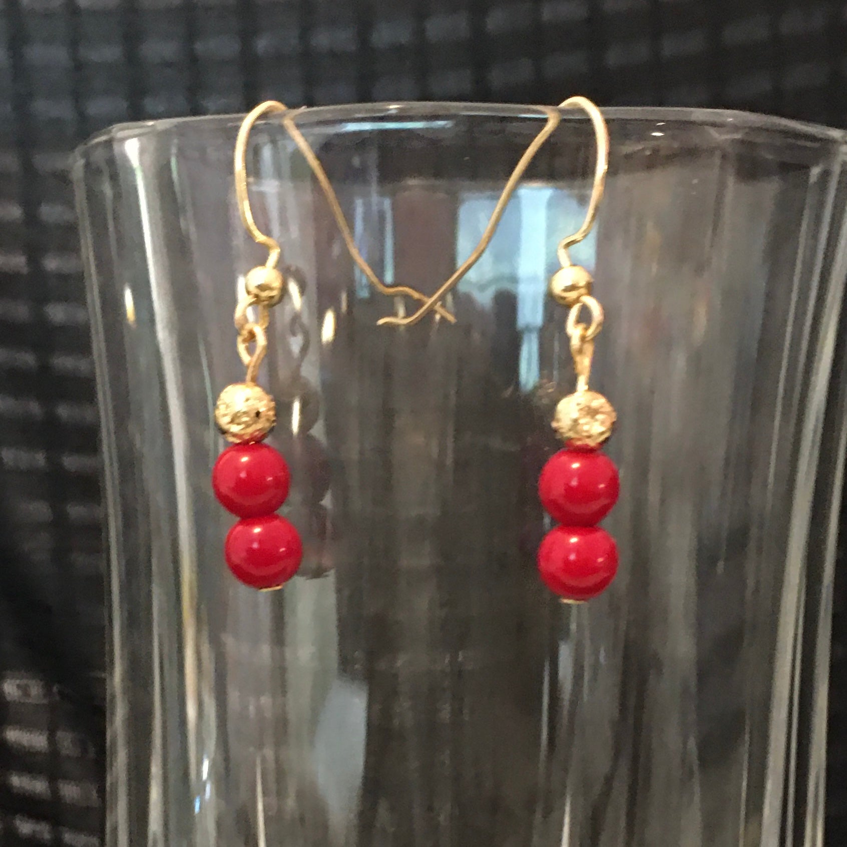 Earrings. Lovely red glass and gold lava on gold hooks.