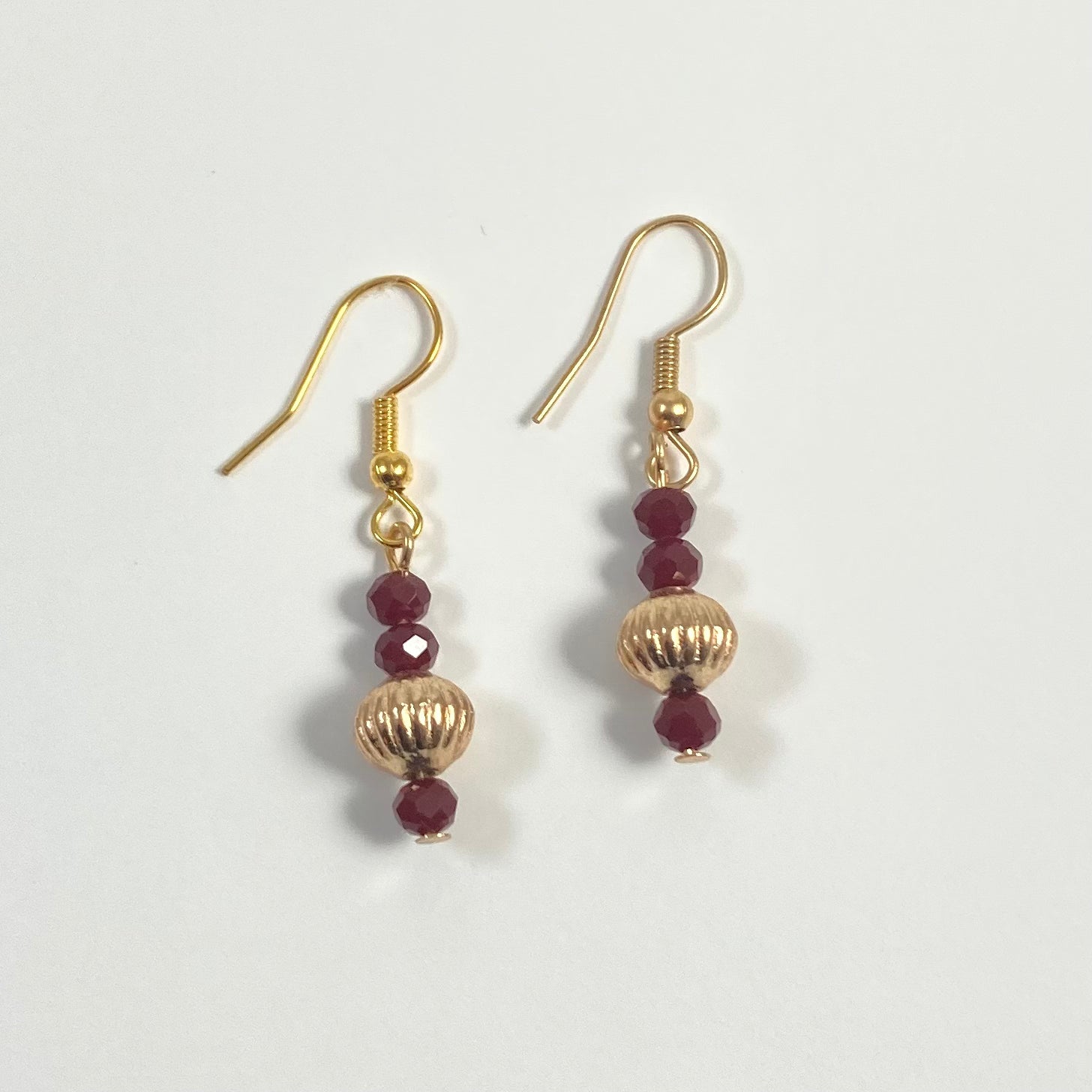 Beautiful deep red faceted glass and decorative gold bicone earrings on gold hooks