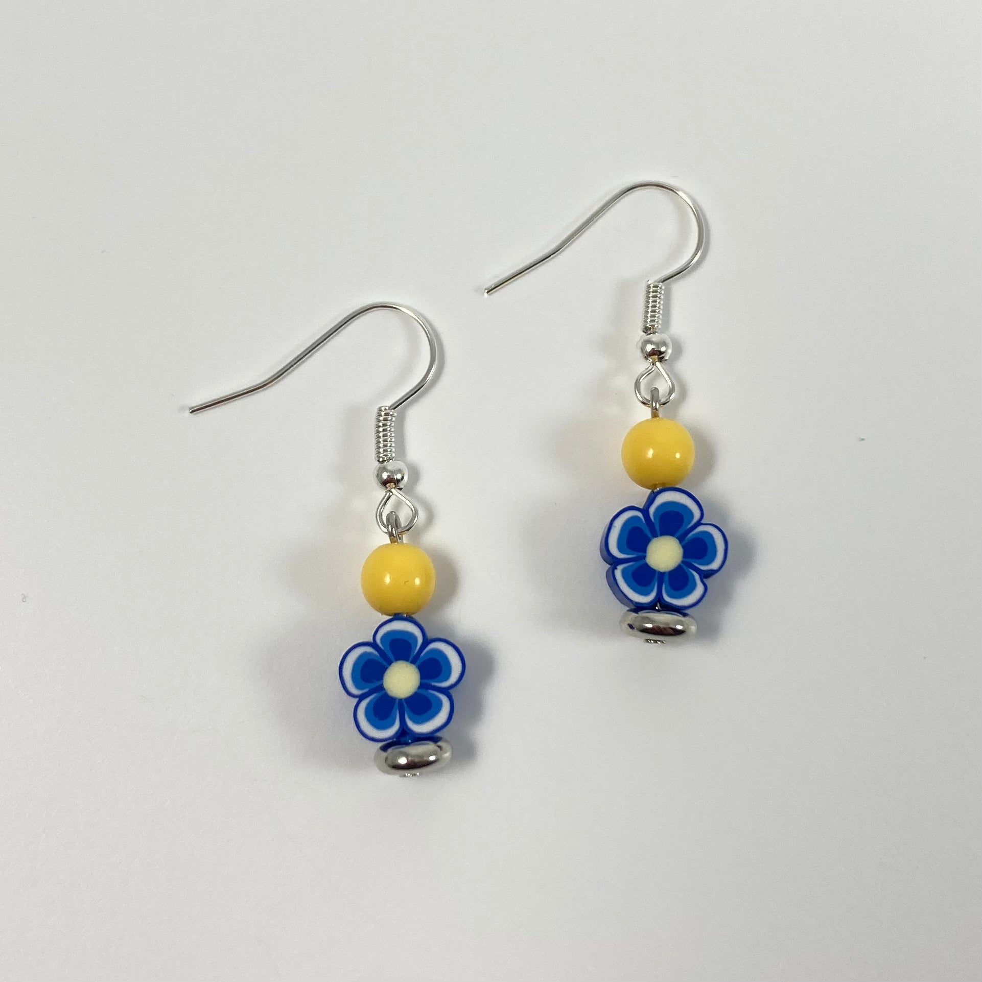 Blue polymer clay flower and yellow bead dangles with silver spacers on silver hooks