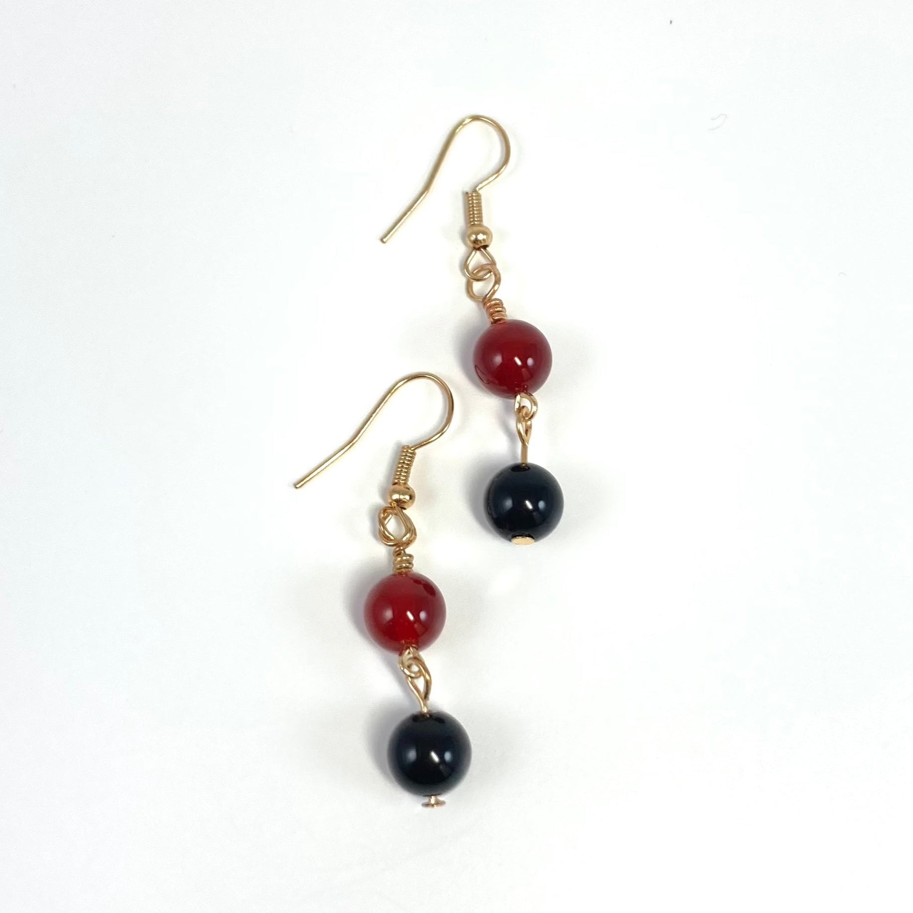 Dangling pomegranate red and black onyx beads on gold hooks