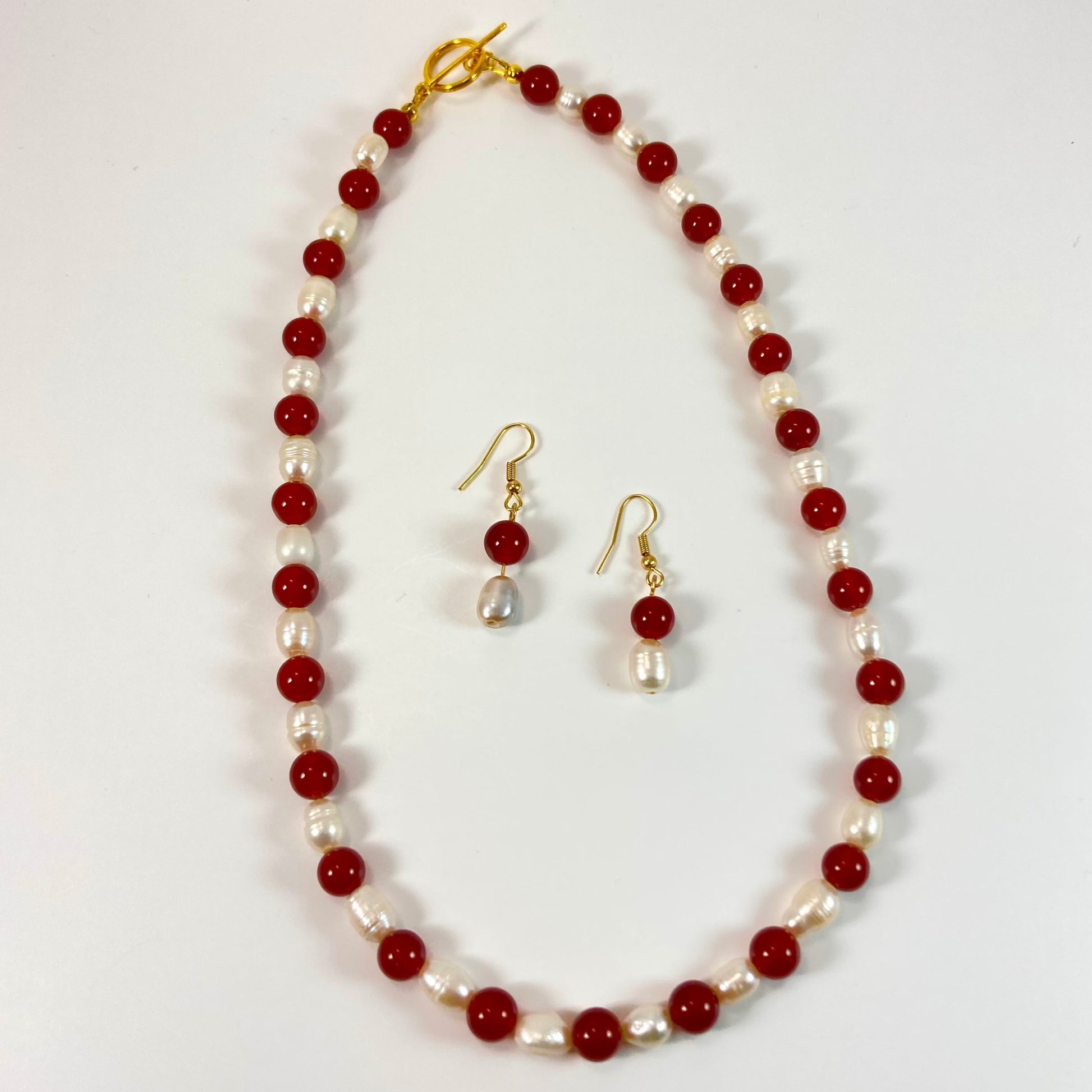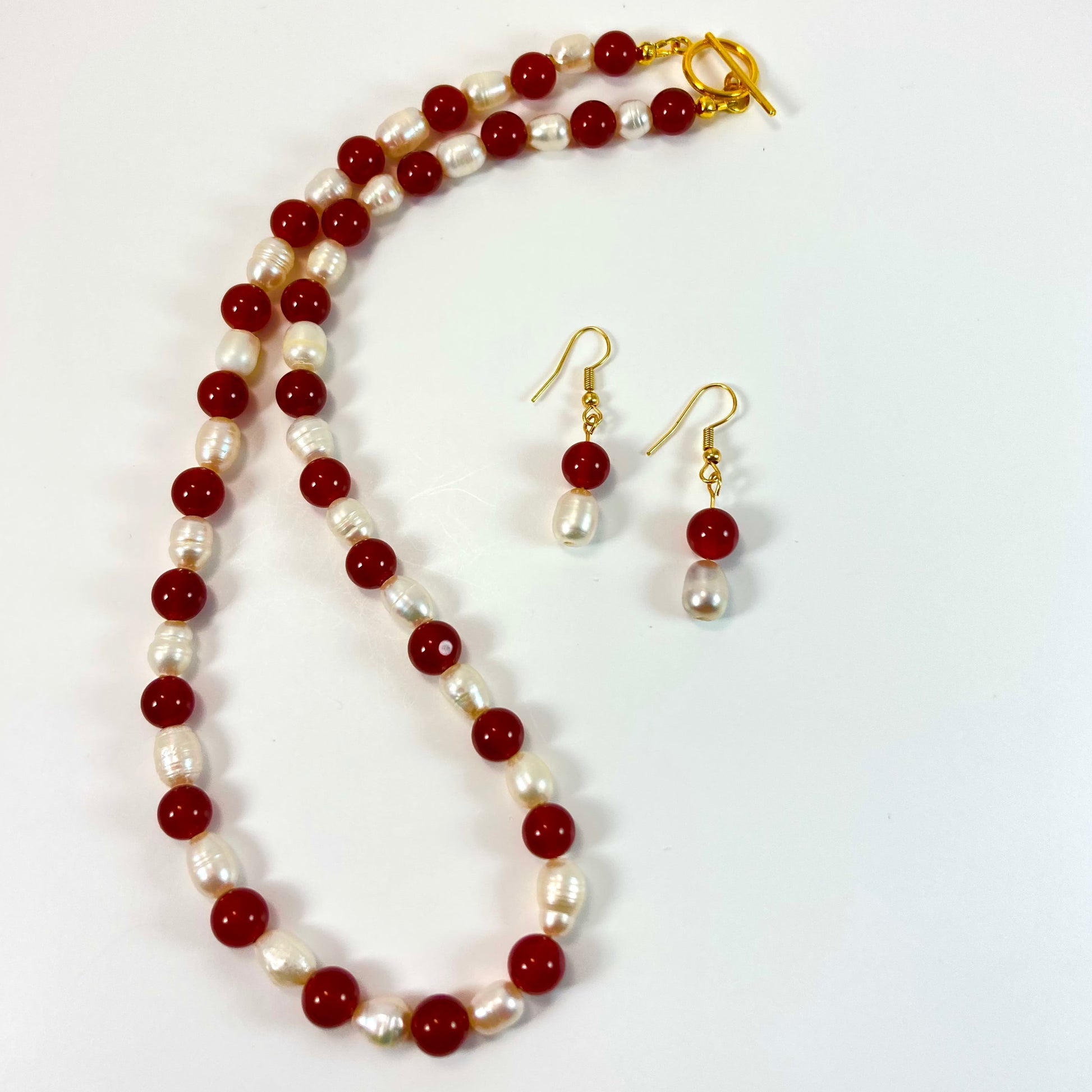 18.5" Strung pomegranate red natural stone beads and natural freshwater pearl beads with gold clasp. Matching earrings with gold s-hooks
