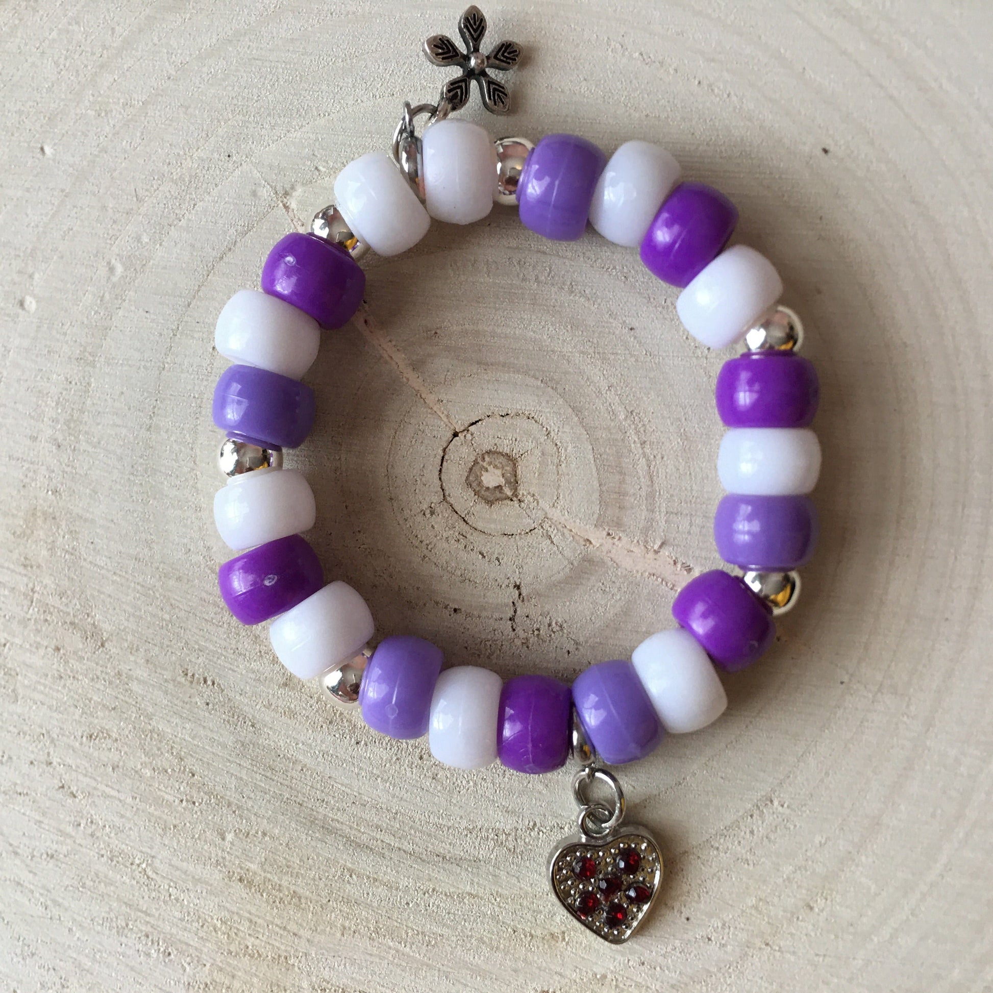Stretch purple and white beads with silver round accents, heart and flower charms