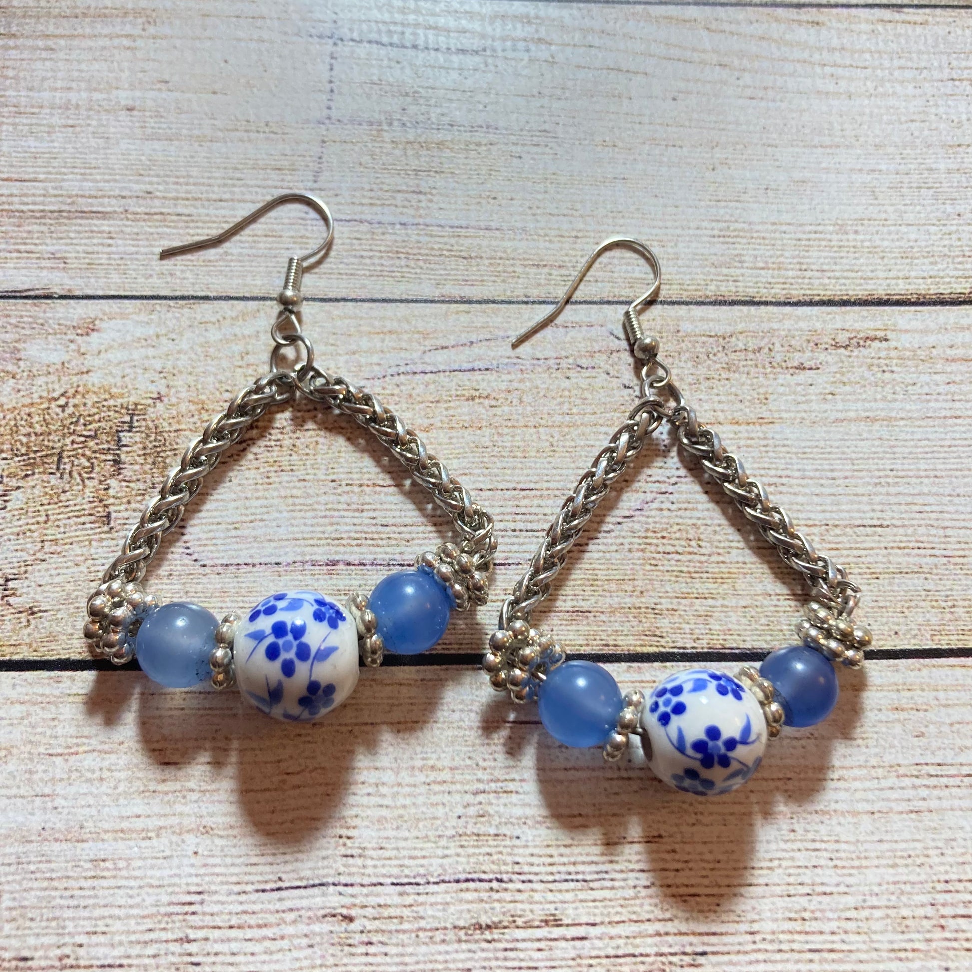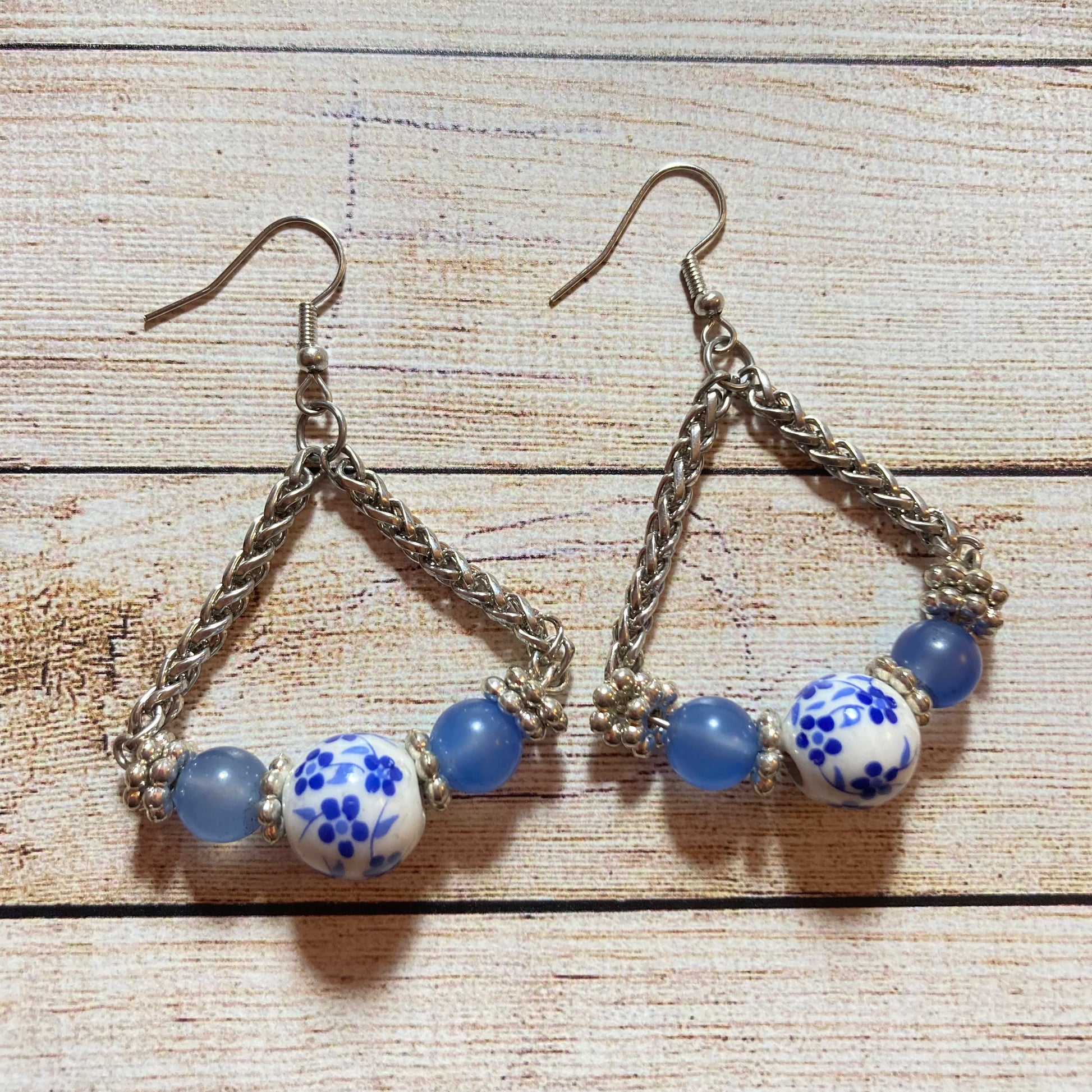 Chic blue & white daisy ceramic focal with blue round agate, silver flower rondelles on silver chain, silver hooks