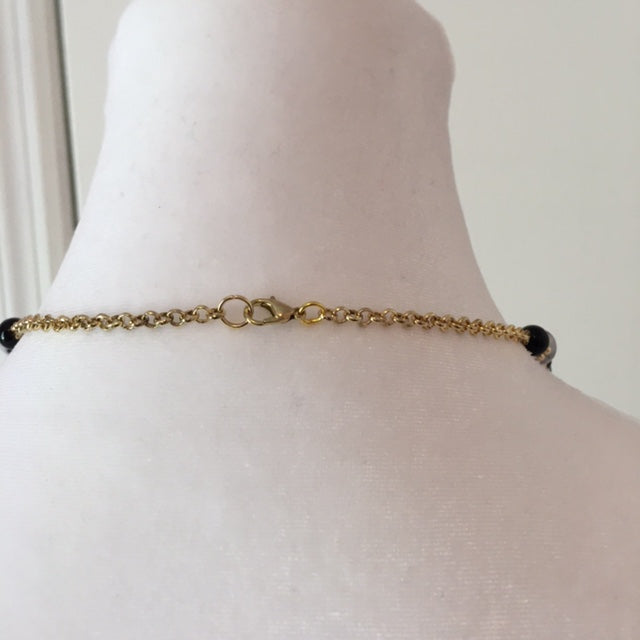 Necklace and earring set. 20" beautiful round glass white/black snake beads and round black agate highlighting black and white ceramic rounds with fancy gold rondelle accents. Gold chain and lobster clasp. Matching earrings on gold hooks
