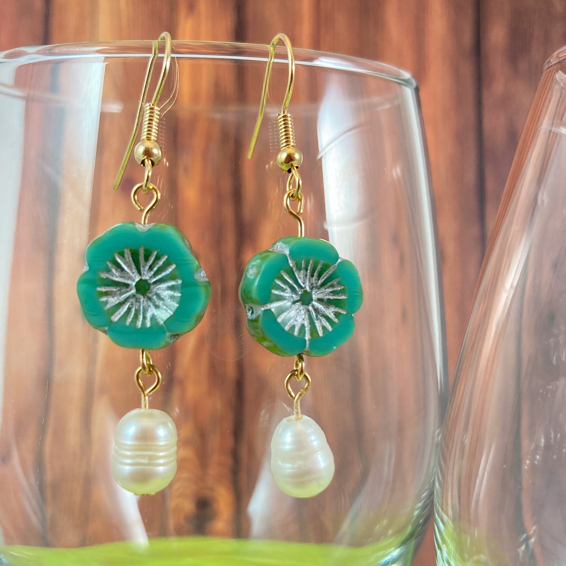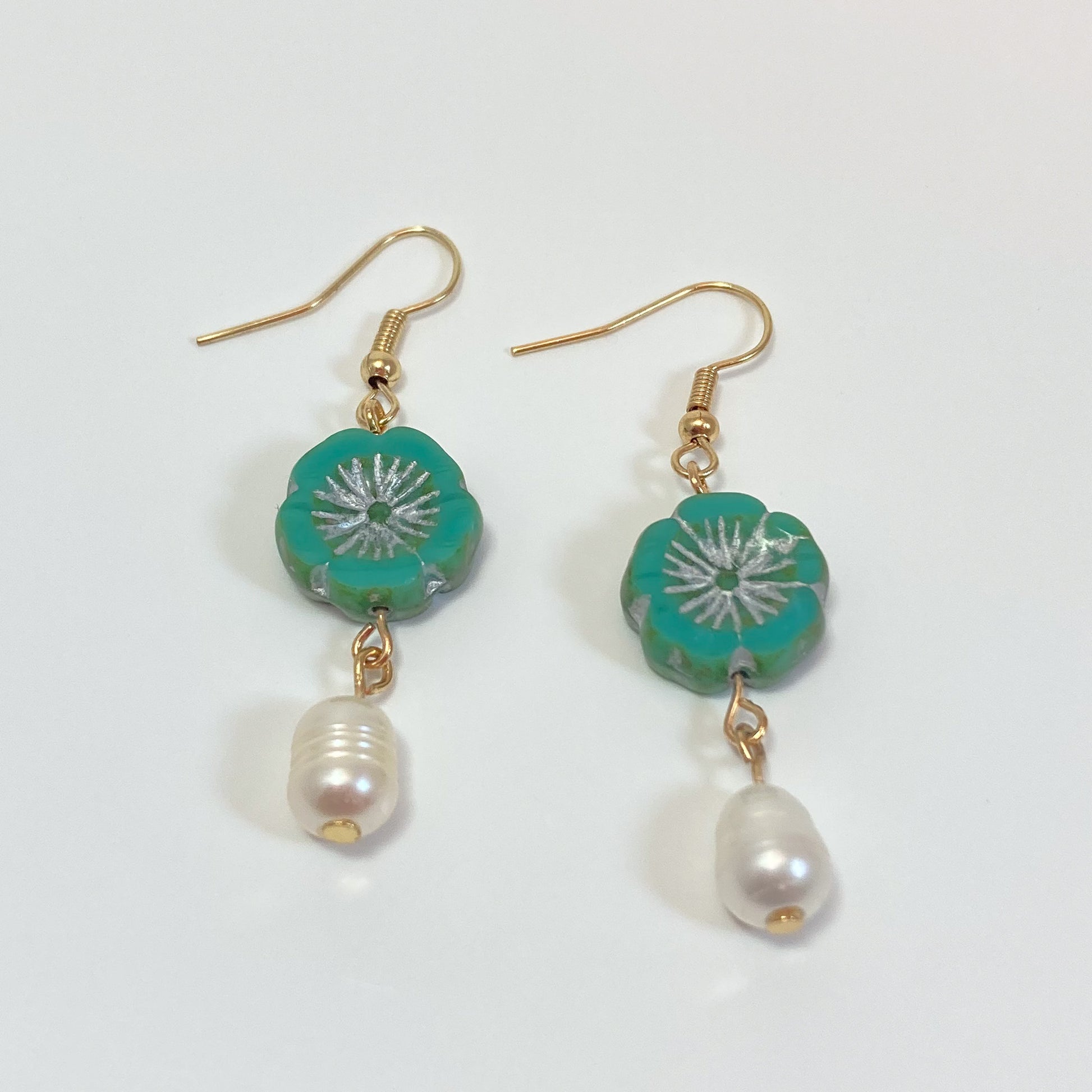 Bohemian turquoise colored flower and freshwater pearls with gold hooks