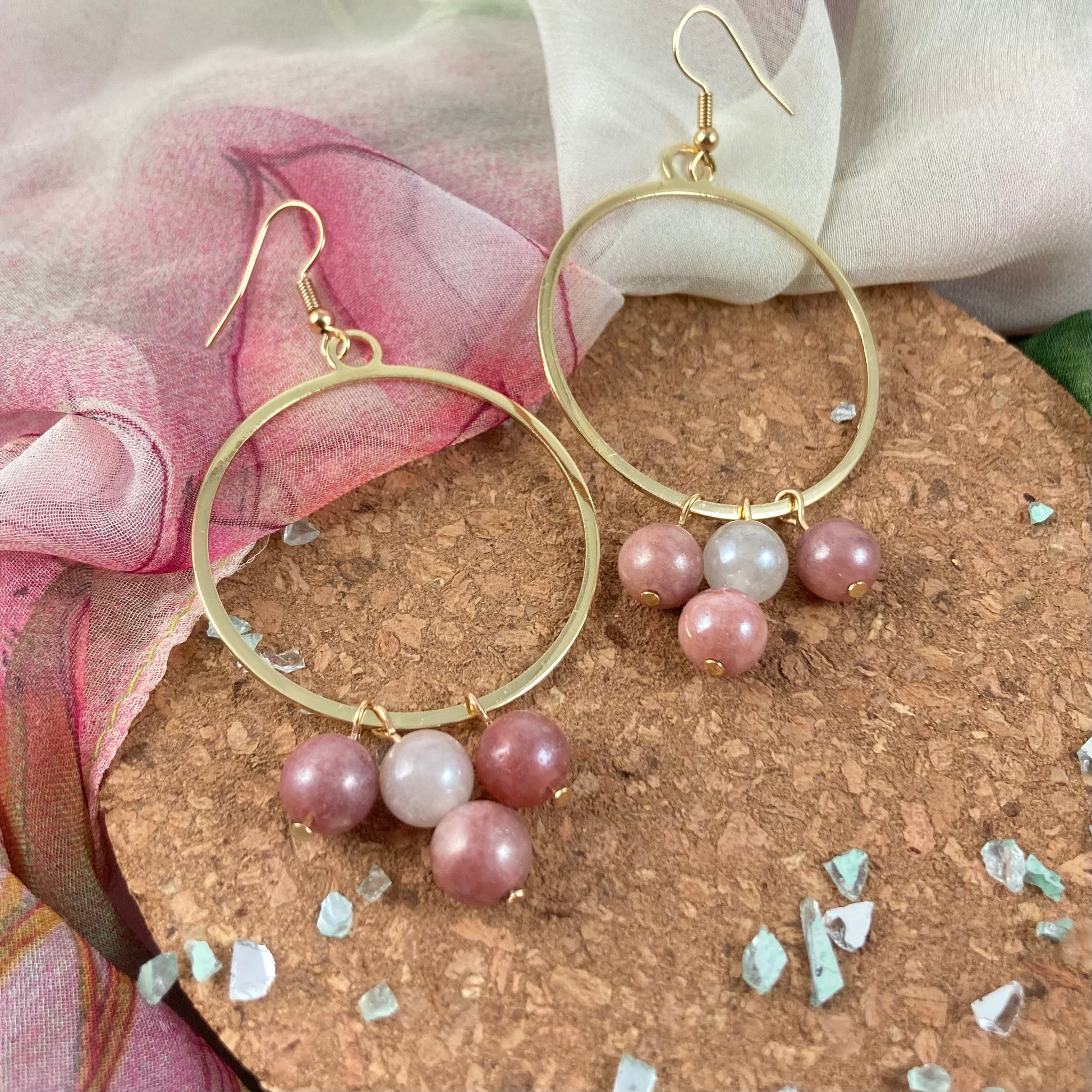 Gold hoop earrings with 3 dangles of 8mm sunstone semi-precious beads. Gold fish hooks
